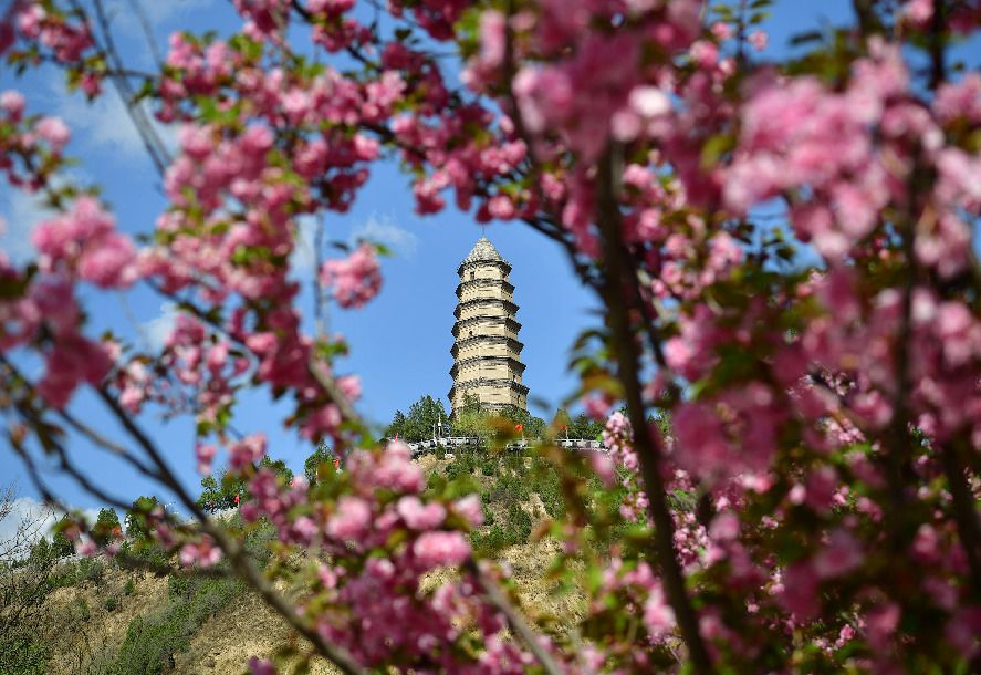 The Baota Mountain scenic area is seen through blooming flowers in Yan'an, northwest China's Shaanxi Province, April 21, 2019. (Xinhua)