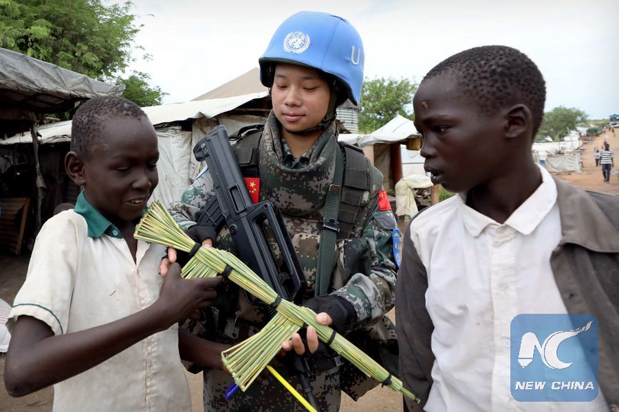File Photo: Local children present a tool rifle to Chinese peacekeeper Yu Peijie (C) as a gift at No.1 refugee camp of the United Nations, South Sudan, on April 30, 2018. (Xinhua/Wang Teng)