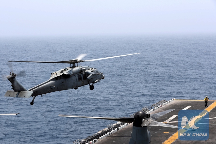 An MH-60S Sea Hawk lands on the flight deck of USS Boxer (LHD-4) in the Arabian Sea off Oman July 16, 2019. (REUTERS Photo)
