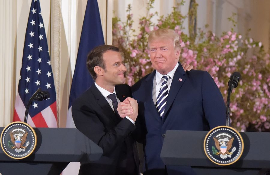 U.S. President Donald Trump (R) and French President Emmanuel Macron attend a joint press conference at the White House in Washington D.C., the United States, April 24, 2018. (Xinhua/Yang Chenglin)