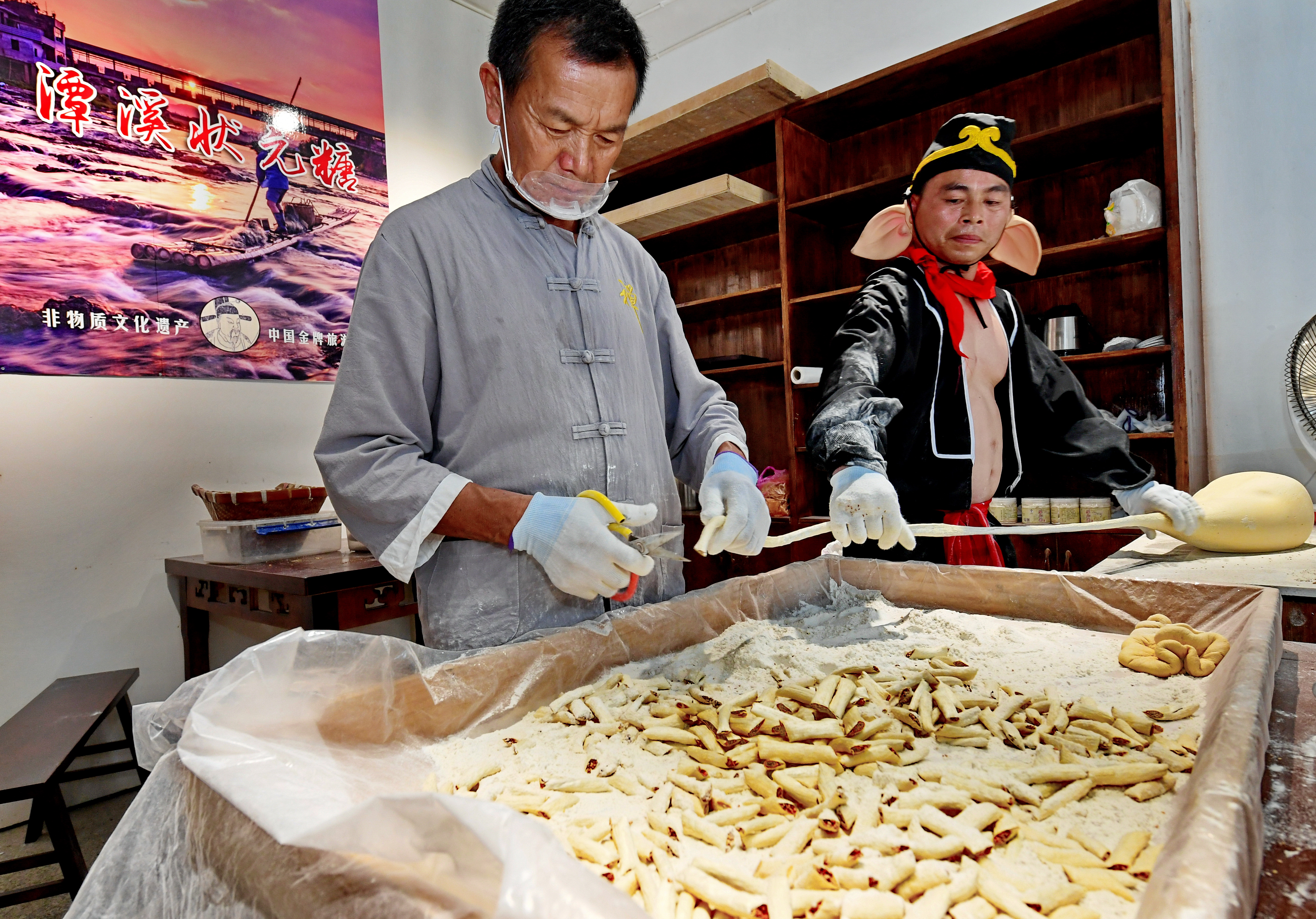 A staff member makes the candy at the Jiangxi style snack street in Shuinan Village, Anyi County, east China's Jiangxi Province, Aug. 8, 2019. (Xinhua/Lu Boan)