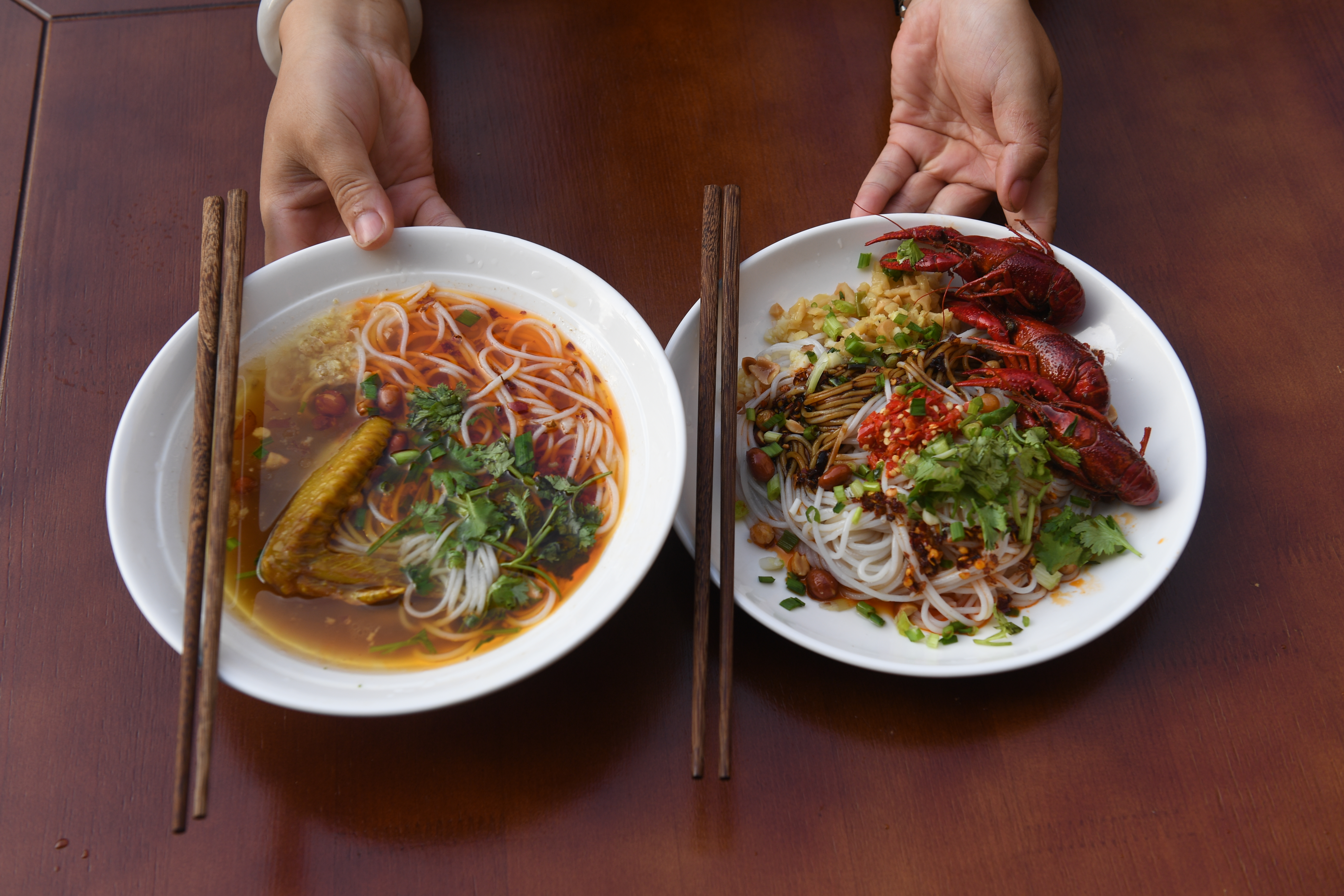 A staff member displays the rice noodles at the Jiangxi style snack street in Shuinan Village, Anyi County, east China's Jiangxi Province, Aug. 8, 2019. (Xinhua/Lu Boan)