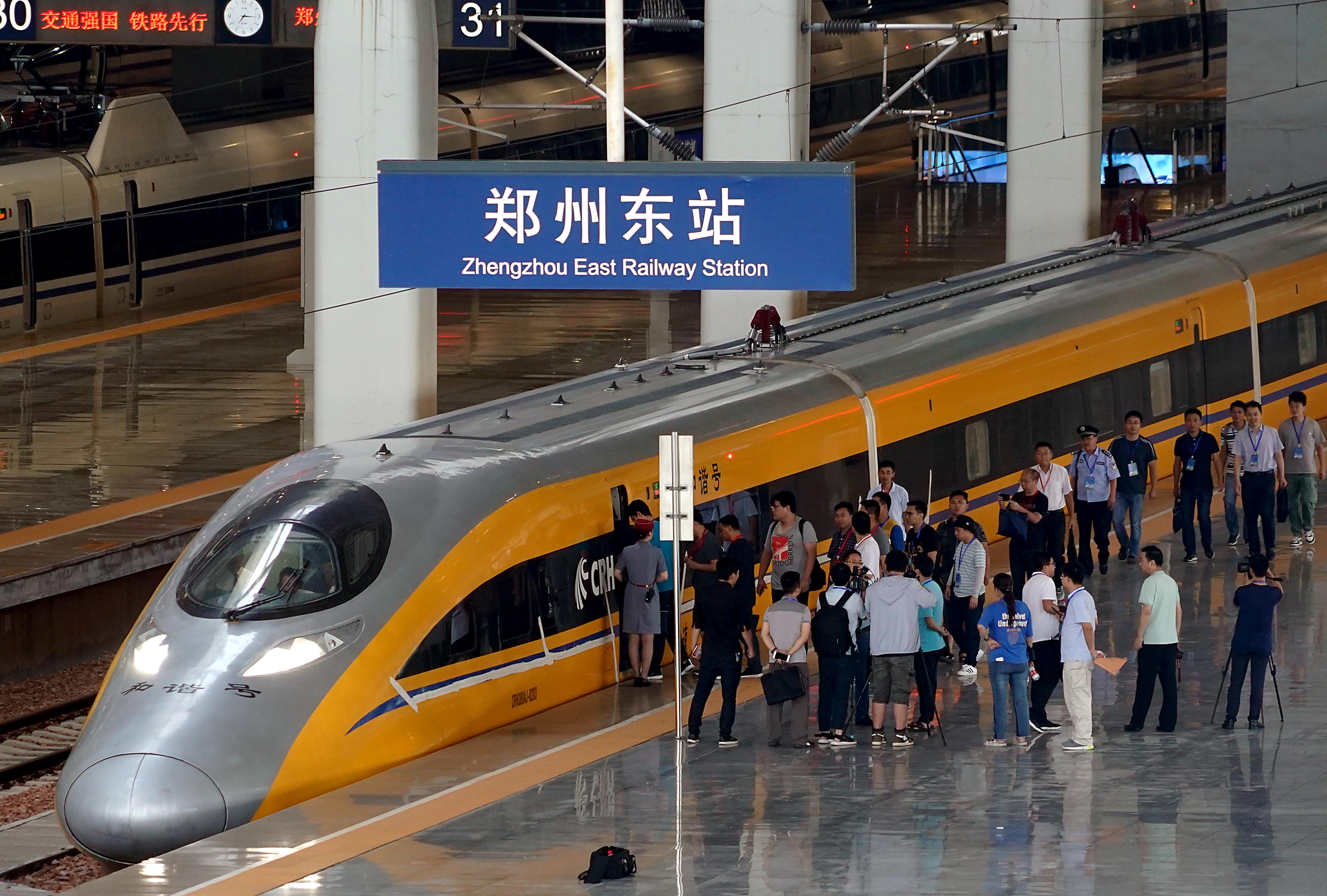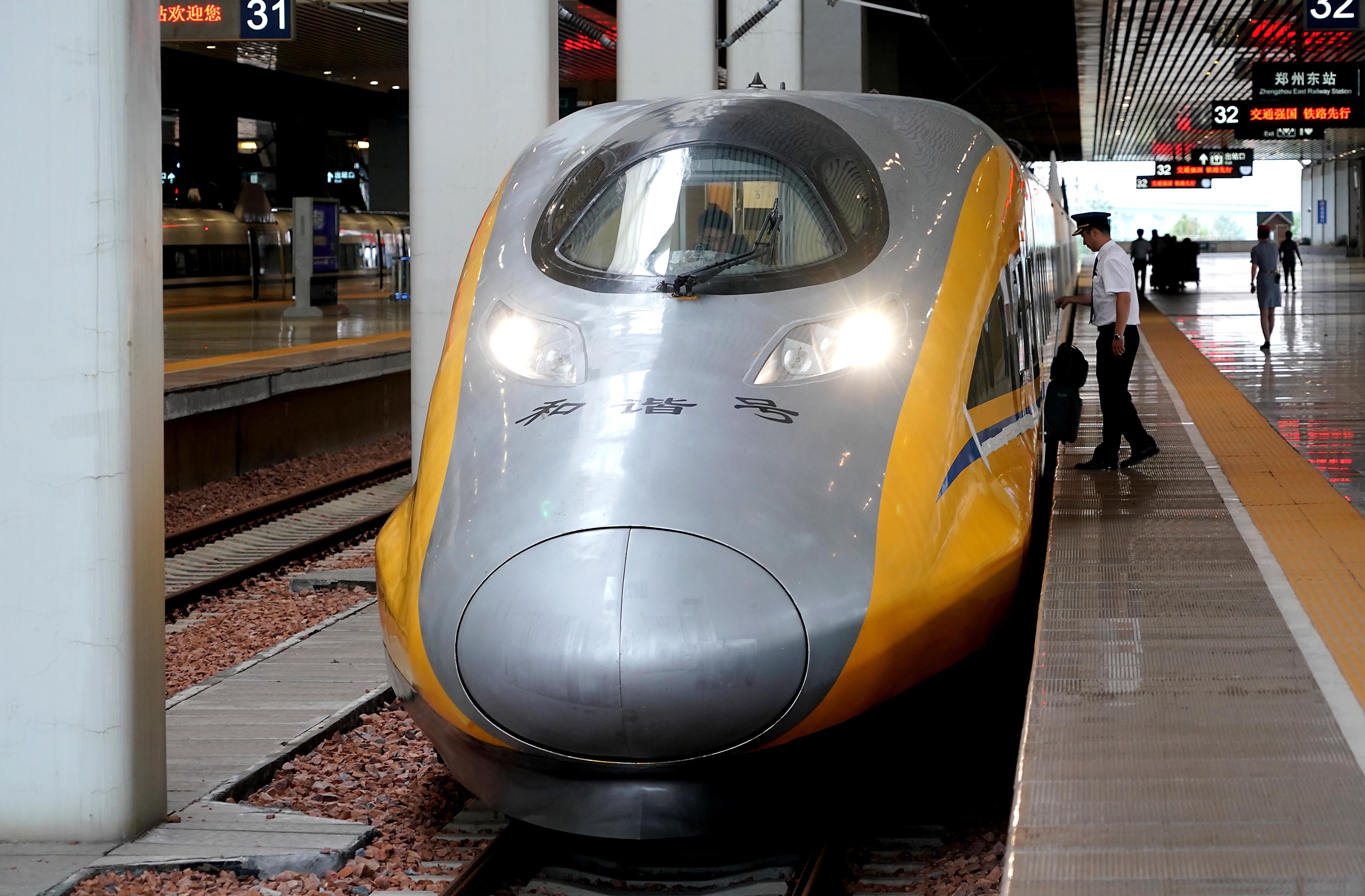 Staff members get on a comprehensive inspection train at Zhengzhou East Railway Station in Zhengzhou, central China's Henan Province. (Xinhua/Li An)