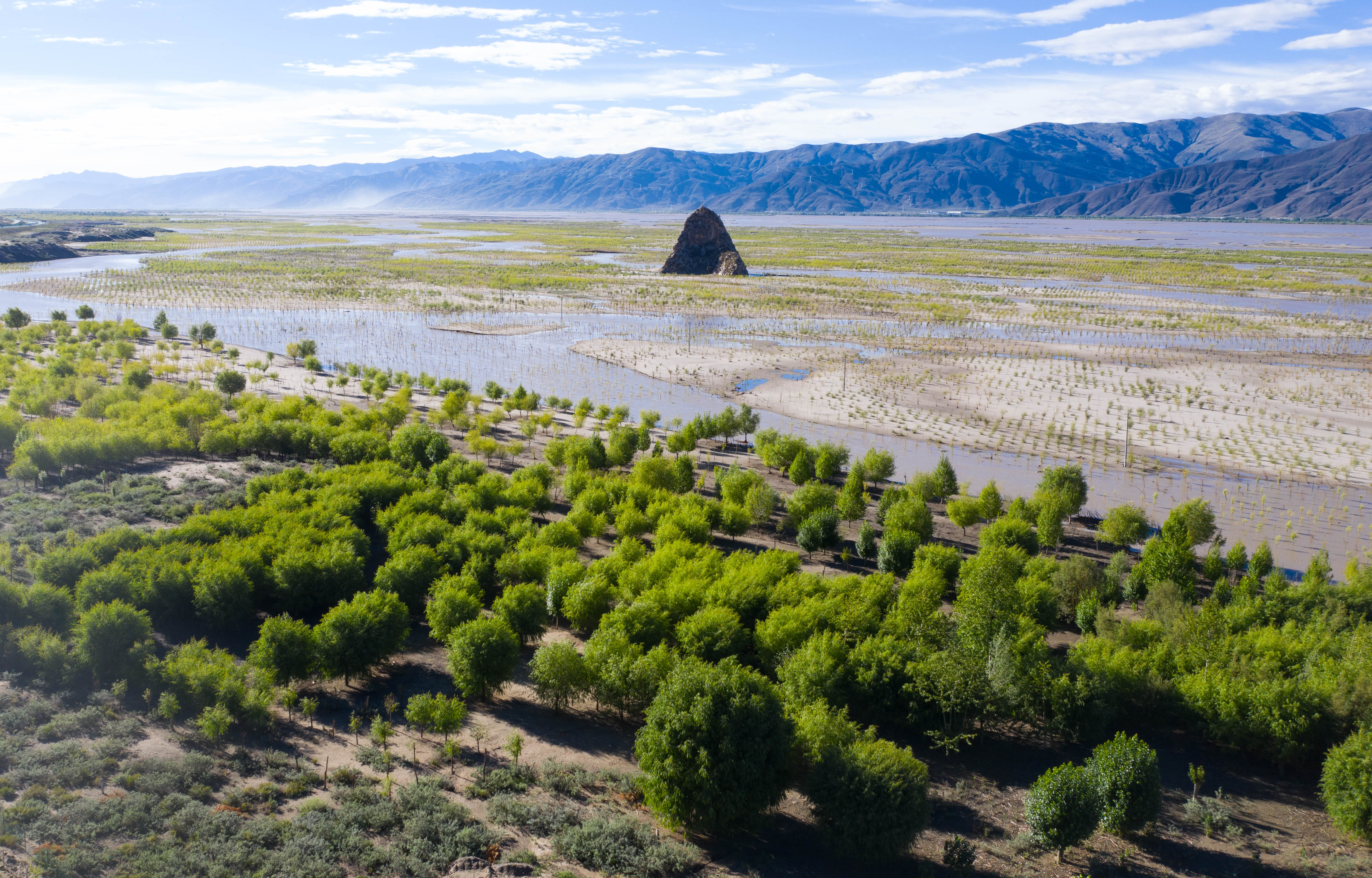 Trees planted along banks of the Yarlung Zangbo River in southwest China's Tibet Autonomous Region. (Xinhua/Purbu Zhaxi)