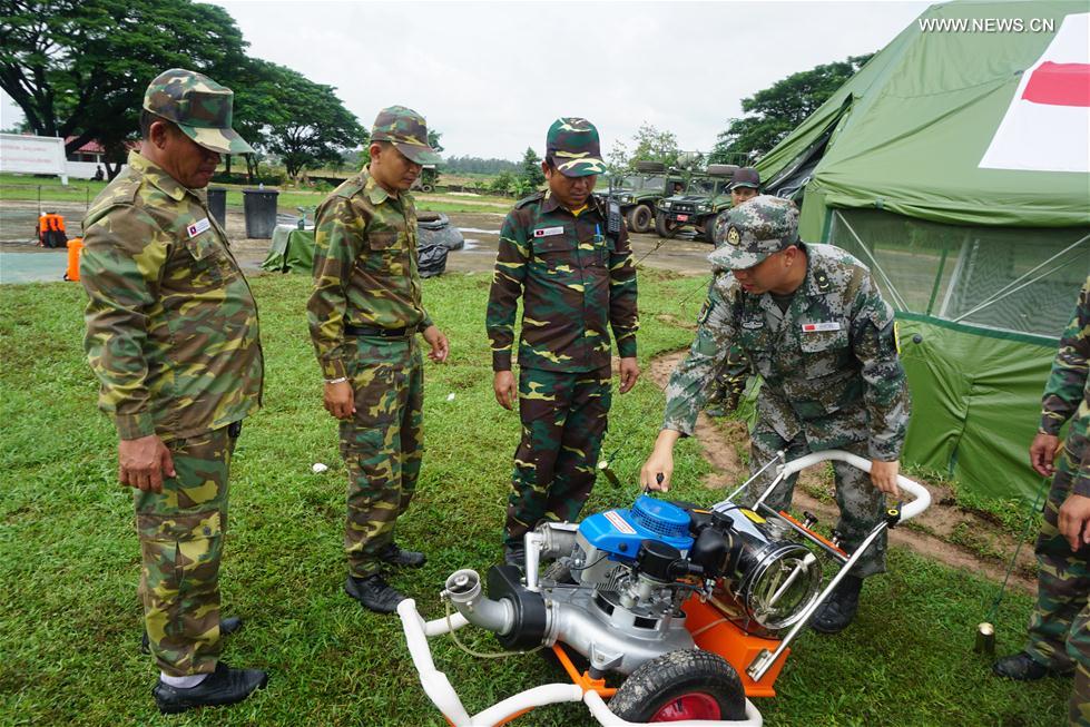 Participants take part in the comprehensive epidemic prevention and control drills during the "Peace Train-2019" China-Laos humanitarian and medical joint rescue exercise in Vientiane, capital of Laos, Aug. 18, 2019. (Peace Train medical team/Handout via Xinhua)