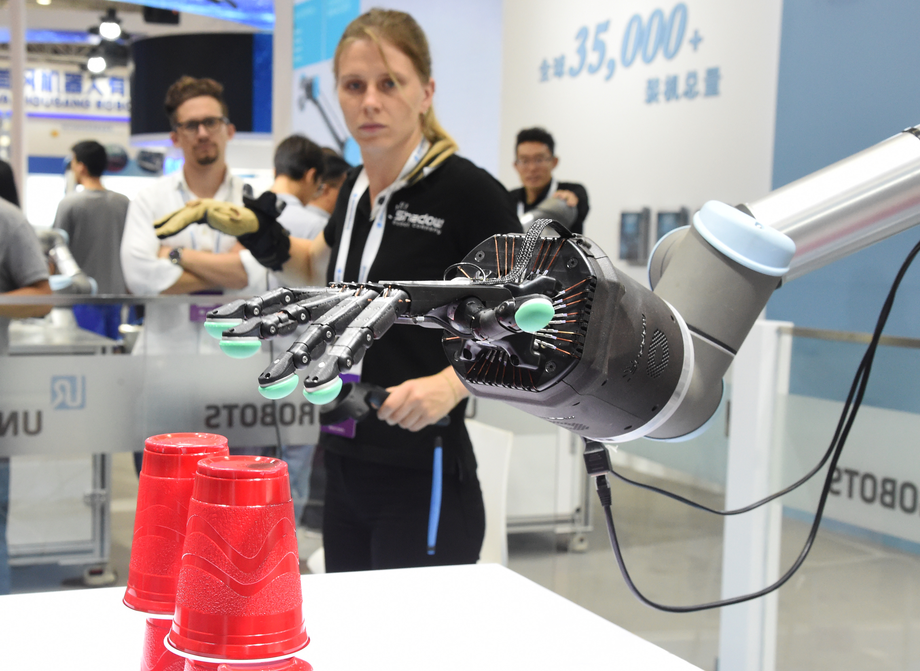 A woman controls a manipulator during the 2019 World Robot Conference in Daxing District of Beijing. (Xinhua/Ren Chao)
