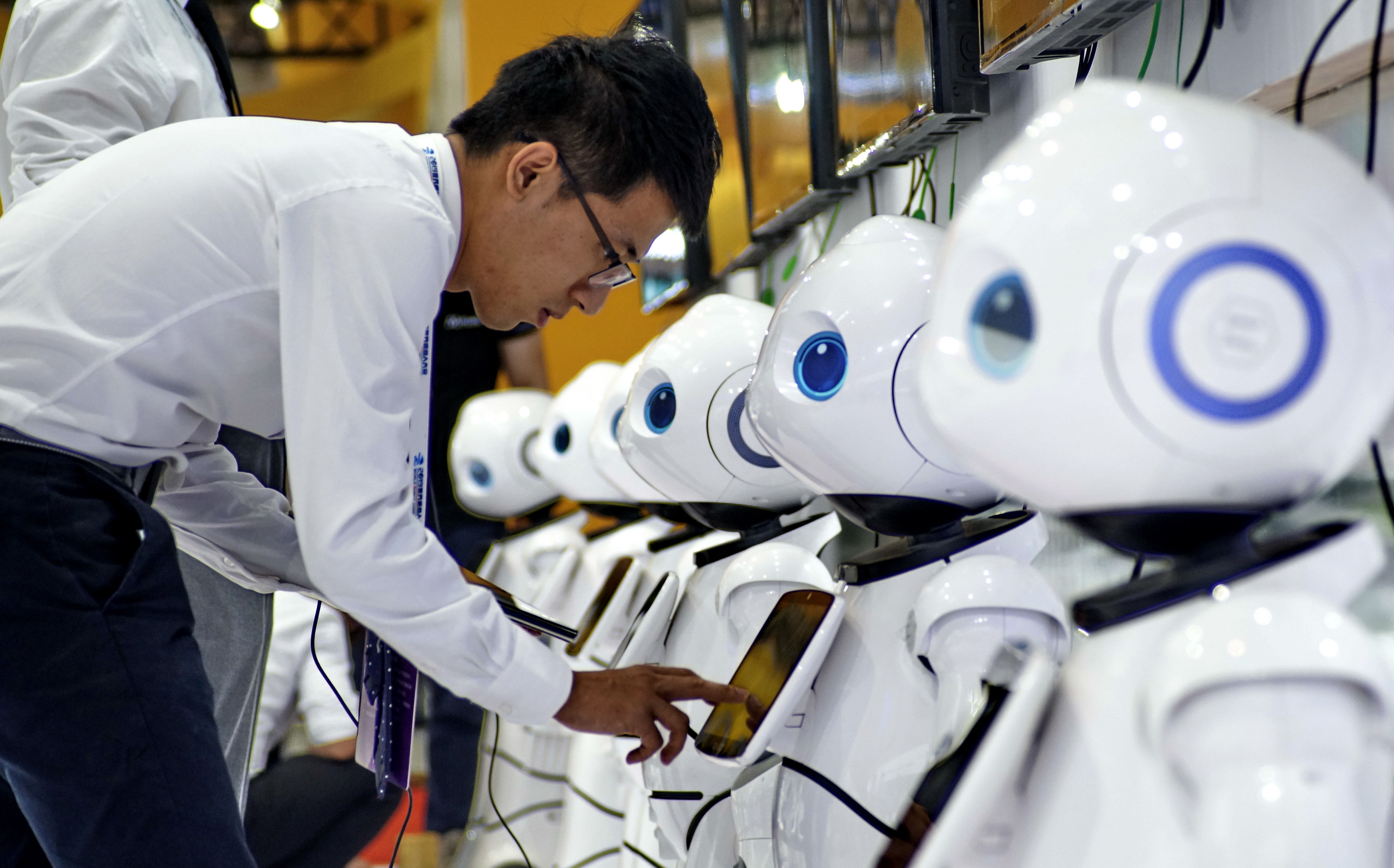 Industrial robots at the 2019 World Robot Conference in Daxing District of Beijing. (Xinhua/Ren Chao)