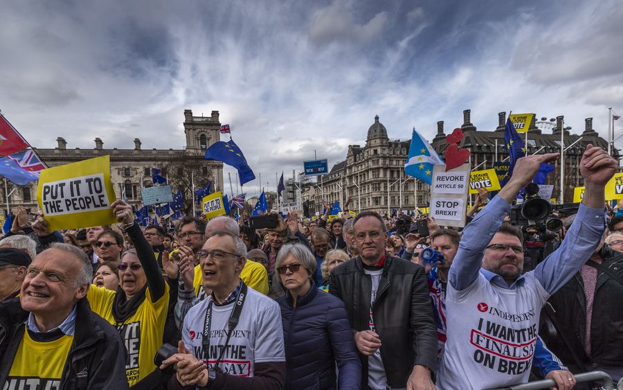 Demonstrators protest during the "Put it to the People" march in central London, Britain, on March 23, 2019. (Xinhua/Han Yan)