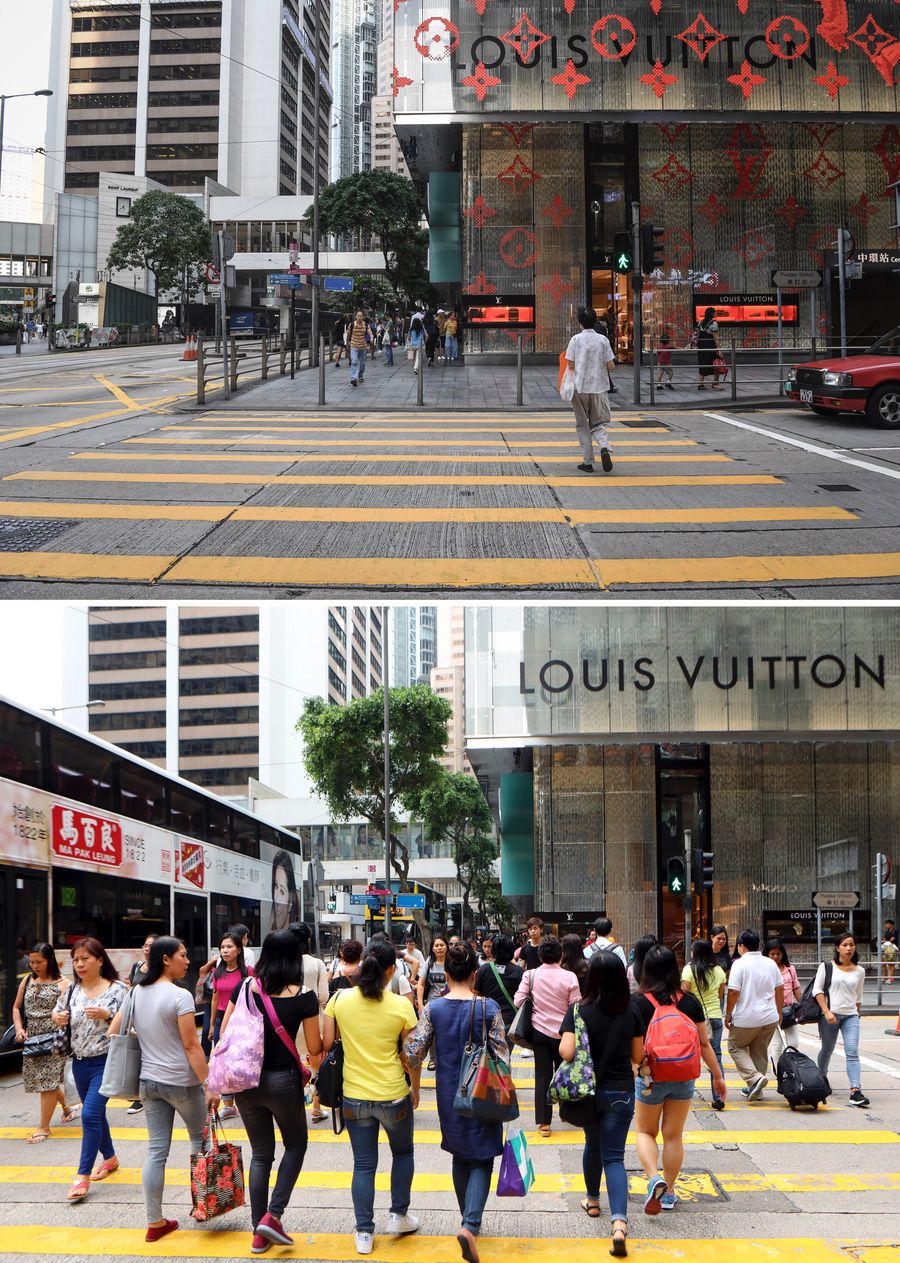 Two photos show the difference before and after the disruptive acts taken by some violent protesters in Hong Kong. (Xinhua/Mao Siqian, Li Peng)