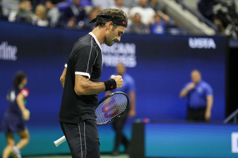 Roger Federer reacts during the men's singles first round match against Sumit Nagal of India at the 2019 US Open in New York, the United States on Aug. 26, 2019. (Xinhua/Li Muzi)