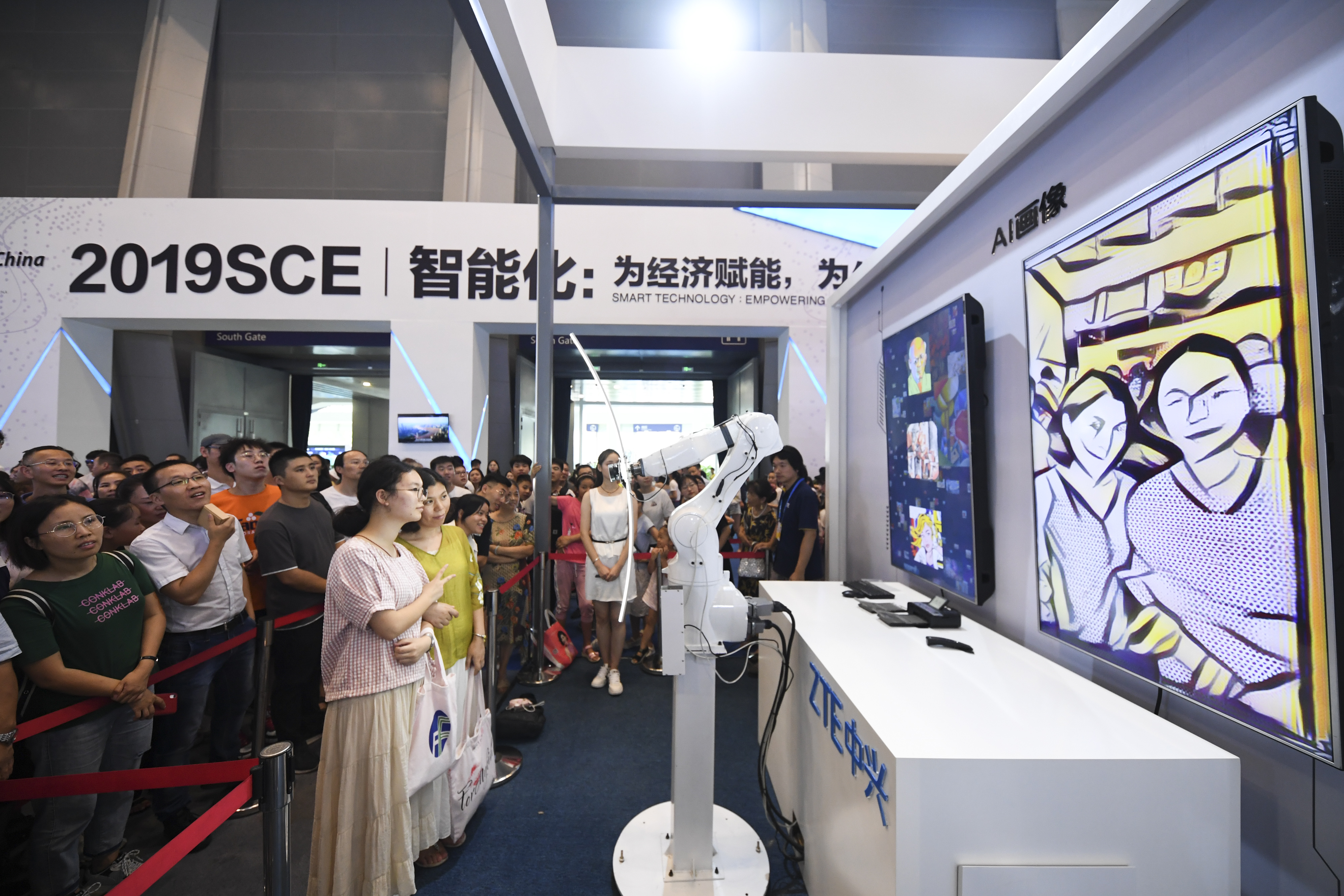 Visitors are portrayed by an AI robot during the 2019 Smart China Expo in southwest China's Chongqing Municipality, Aug. 27, 2019. (Xinhua/Wang Quanchao)