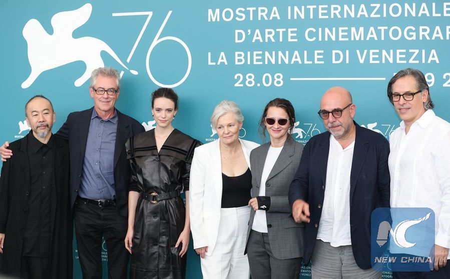 Main competition jury president Lucrecia Martel (3rd R) and other jury members pose for photos during a photocall at the 76th Venice International Film Festival in Venice, Italy, Aug. 28, 2019. (Xinhua/Cheng Tingting)