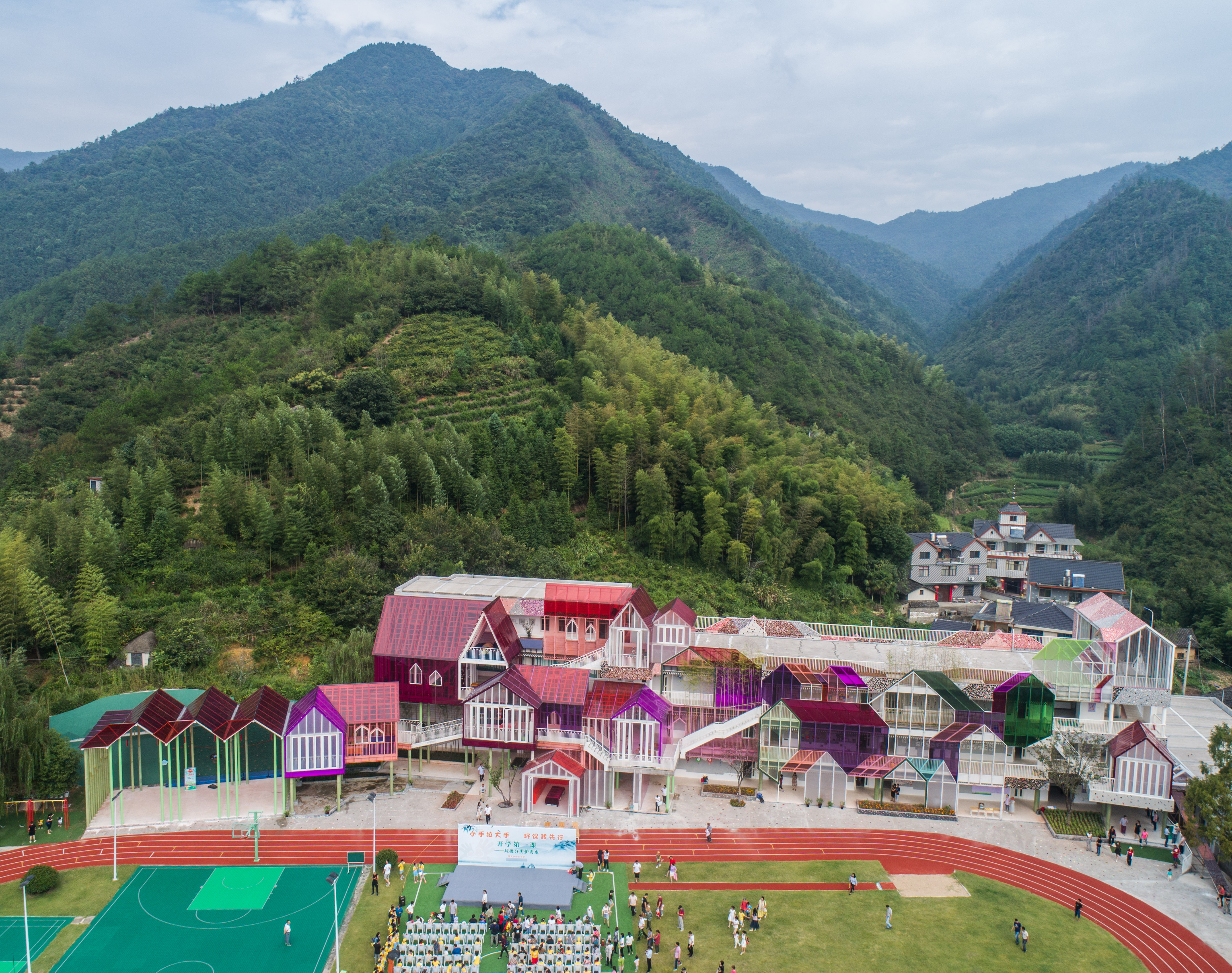 Aerial photo taken on Aug. 31, 2019 shows Central Primary School of Fuwen Township at Fuwen Village of Chun'an County in Hangzhou, capital of east China's Zhejiang Province.(Xinhua/Xu Yu)