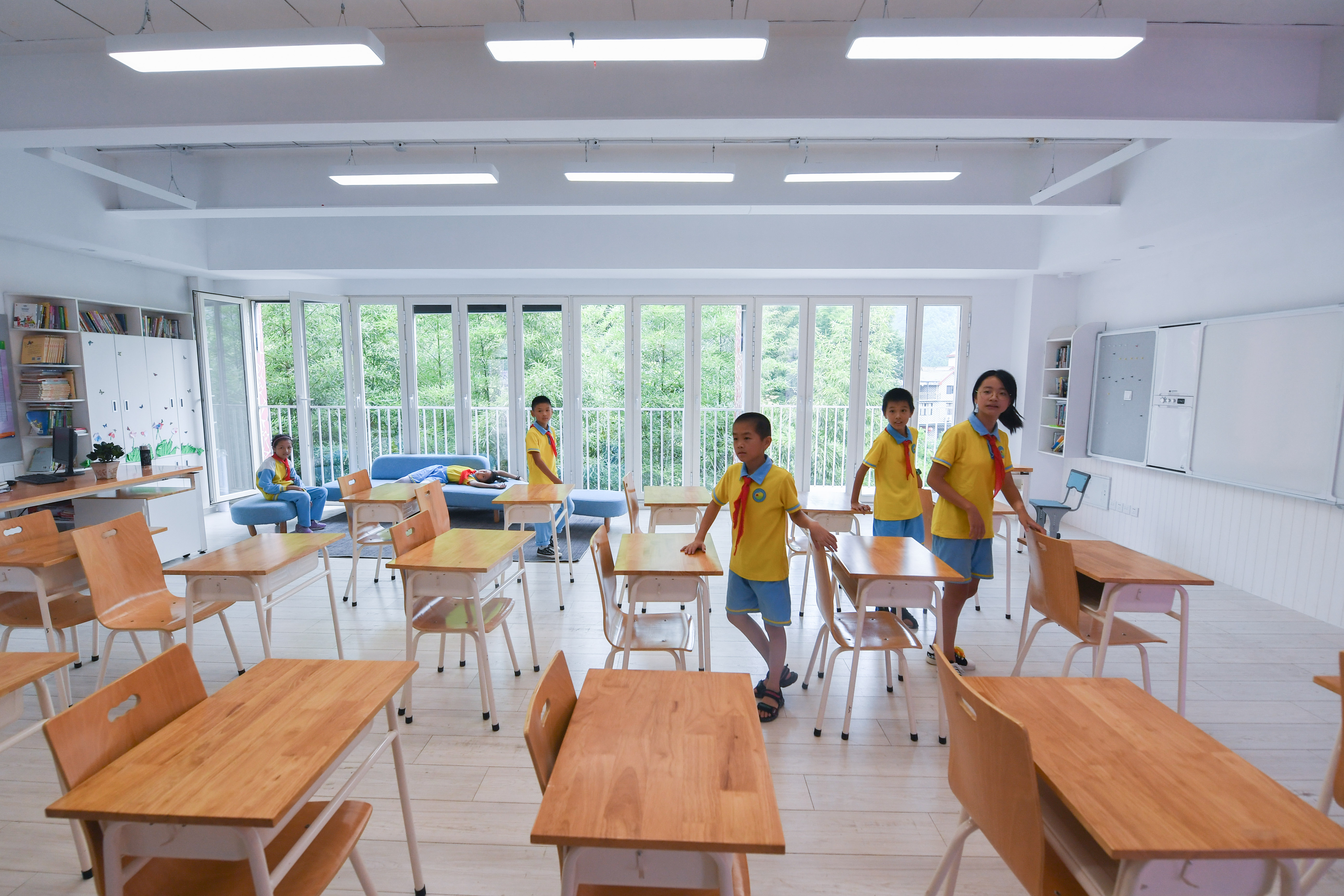 Students rest at a classroom after the school opening ceremony in Central Primary School of Fuwen Township at Fuwen Village of Chun'an County in Hangzhou, capital of east China's Zhejiang Province, Aug. 31, 2019.(Xinhua/Xu Yu)