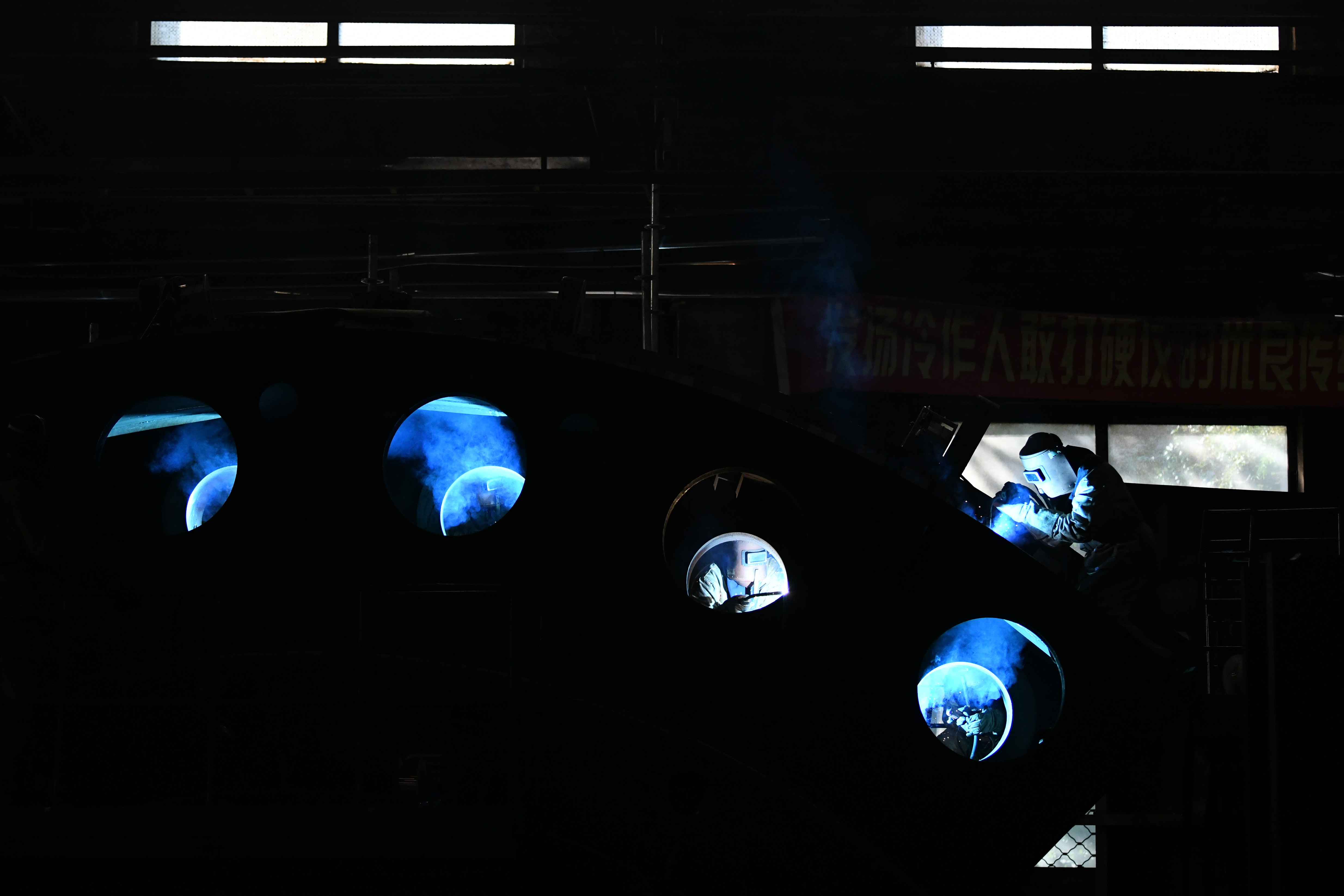 Workers weld components at a factory of Harbin Electric Machinery Company Limited in Harbin, Sept. 2, 2019. (Xinhua/Wang Jianwei)