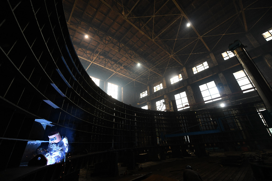A worker is seen at a boiler production factory of Harbin Boiler Company Limited in Harbin, Sept. 4, 2019. (Xinhua/Wang Jianwei)