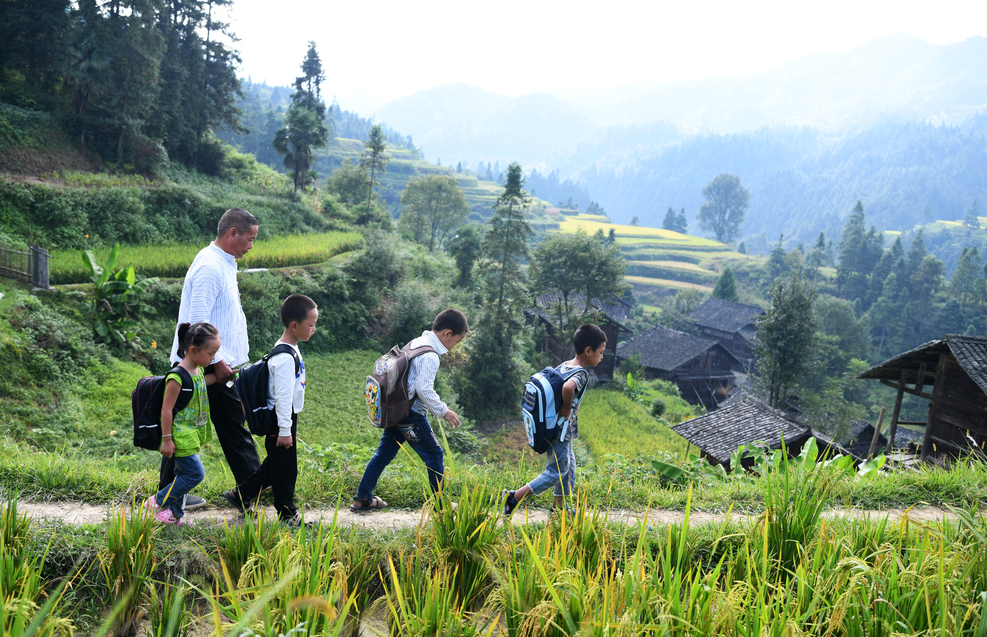Jiang Tongying escorts children back home after school at Hua'ao Village in Jianhe County of Qiandongnan Miao and Dong Autonomous Prefecture, southwest China's Guizhou Province, Sept. 5, 2019. (Xinhua/Yang Wenbin)