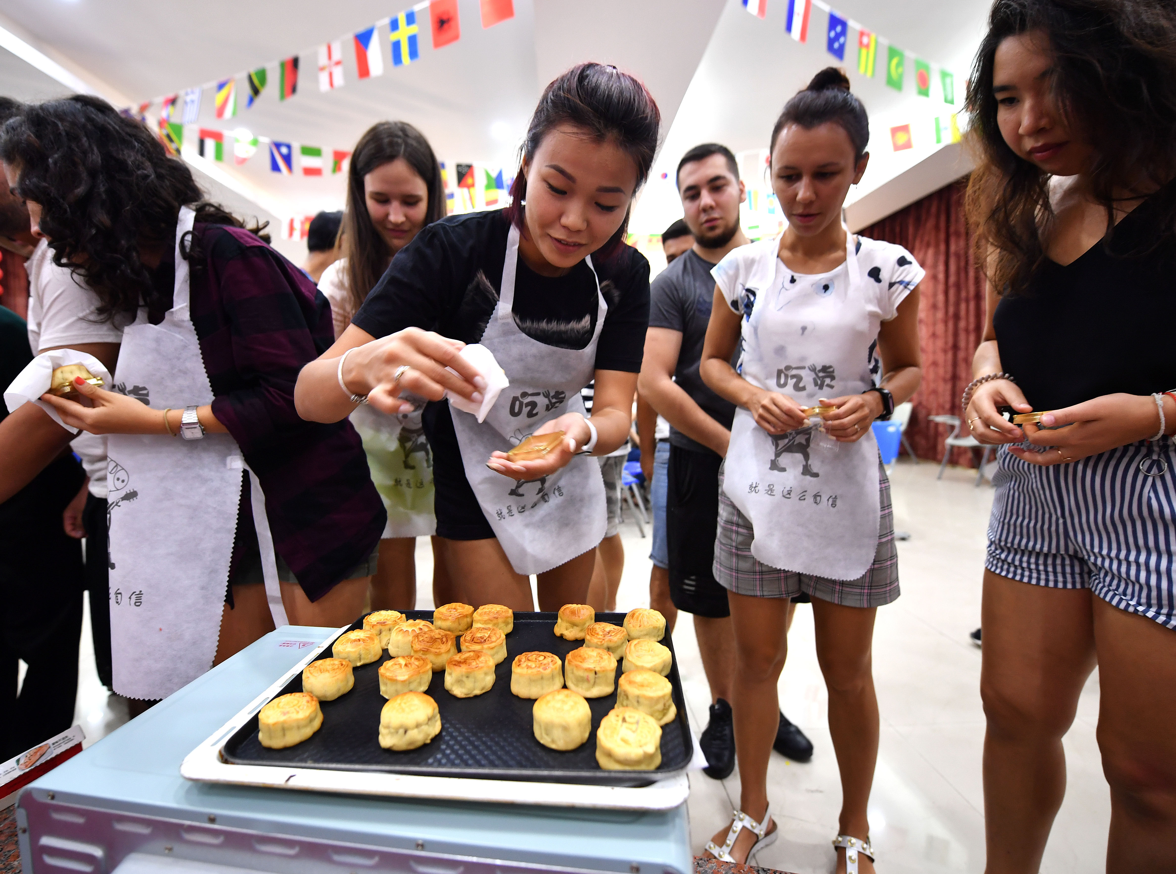 Overseas students from Hainan University prepare to taste mooncakes made by themselves in Haikou, capital of south China's Hainan Province, Sept. 12, 2019. (Xinhua/Guo Cheng)