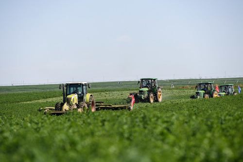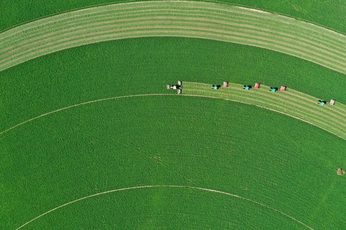 Aerial photo taken on Sept. 20, 2019 shows harvesters cropping alfalfa in Ar Horqin Banner of north China's Inner Mongolia Autonomous Region.(Xinhua)