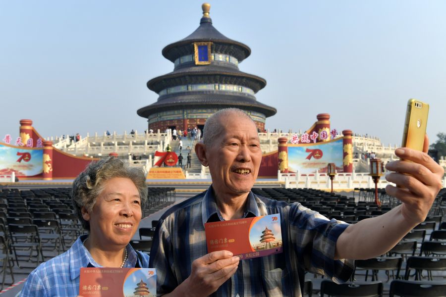 Tourists pose for a selfie at the Temple of Heaven on the occasion of the Chinese National Day in Beijing, capital of China, Oct. 1, 2019. (Xinhua/Cao Yang)