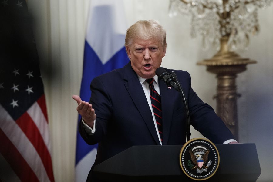 U.S. President Donald Trump attends a joint press conference with visiting Finnish President Sauli Niinisto (not in the picture) at the White House in Washington D.C., the United States, on Oct. 2, 2019. (Photo by Ting Shen/Xinhua)