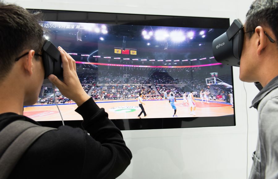 Visitors watch a live broadcast of a basketball game via VR and 5G-powered devices at the Light of the Internet Expo Center in Wuzhen, east China's Zhejiang Province, Oct. 19, 2019. (Xinhua/Zhang Xiaoyu)