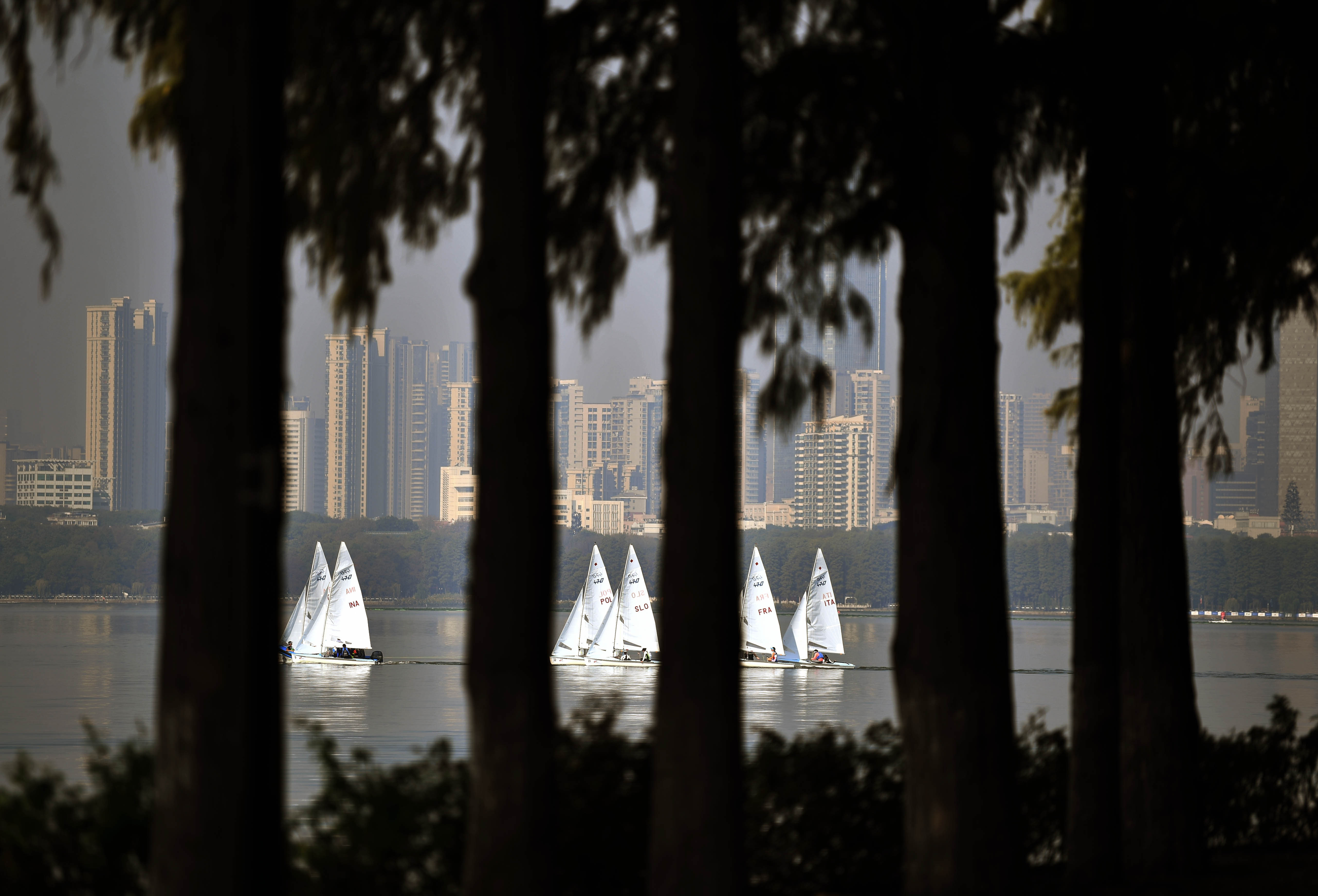 Sailing boats wait to attend a sailing contest at the 7th CISM Military World Games at East Lake in central China's Wuhan, capital of central China's Hubei Province, Oct. 21, 2019. (Xinhua/Li Ga)