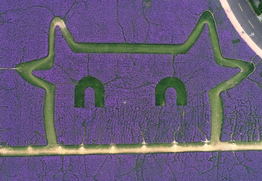Aerial photo taken on July 17, 2019 shows a verbena field in Binhai New Area of north China's Tianjin. (Xinhua/Yue Yuewei)