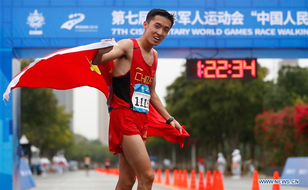 Xu Hao of China celebrates after men's 20km race walk final of track and field at the 7th CISM Military World Games in Wuhan, capital of central China's Hubei Province, Oct. 25, 2019. (Xinhua/Wang Lili)