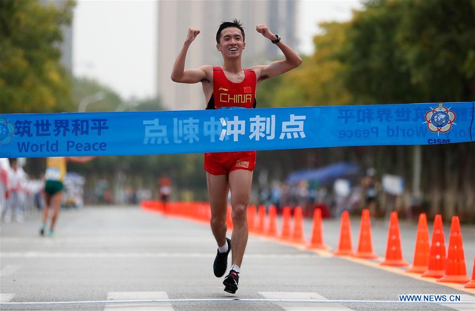 Xu Hao (front) of China competes during men's 20km race walk final of track and field at the 7th CISM Military World Games in Wuhan, capital of central China's Hubei Province, Oct. 25, 2019. (Xinhua/Wang Lili)