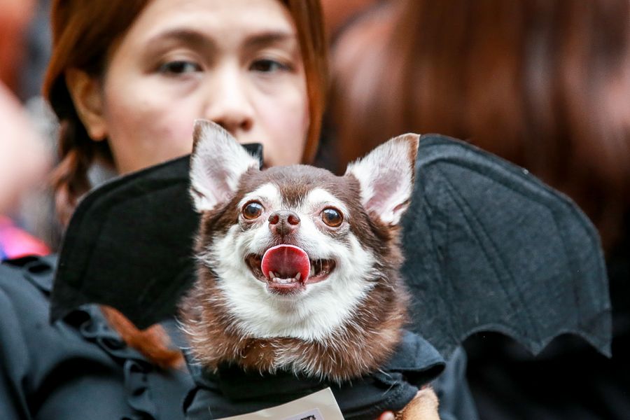 A dog dressed in Halloween costume is seen during the "Petrified" Halloween celebration in Quezon City, the Philippines, Oct. 27, 2019. (Xinhua/Rouelle Umali)