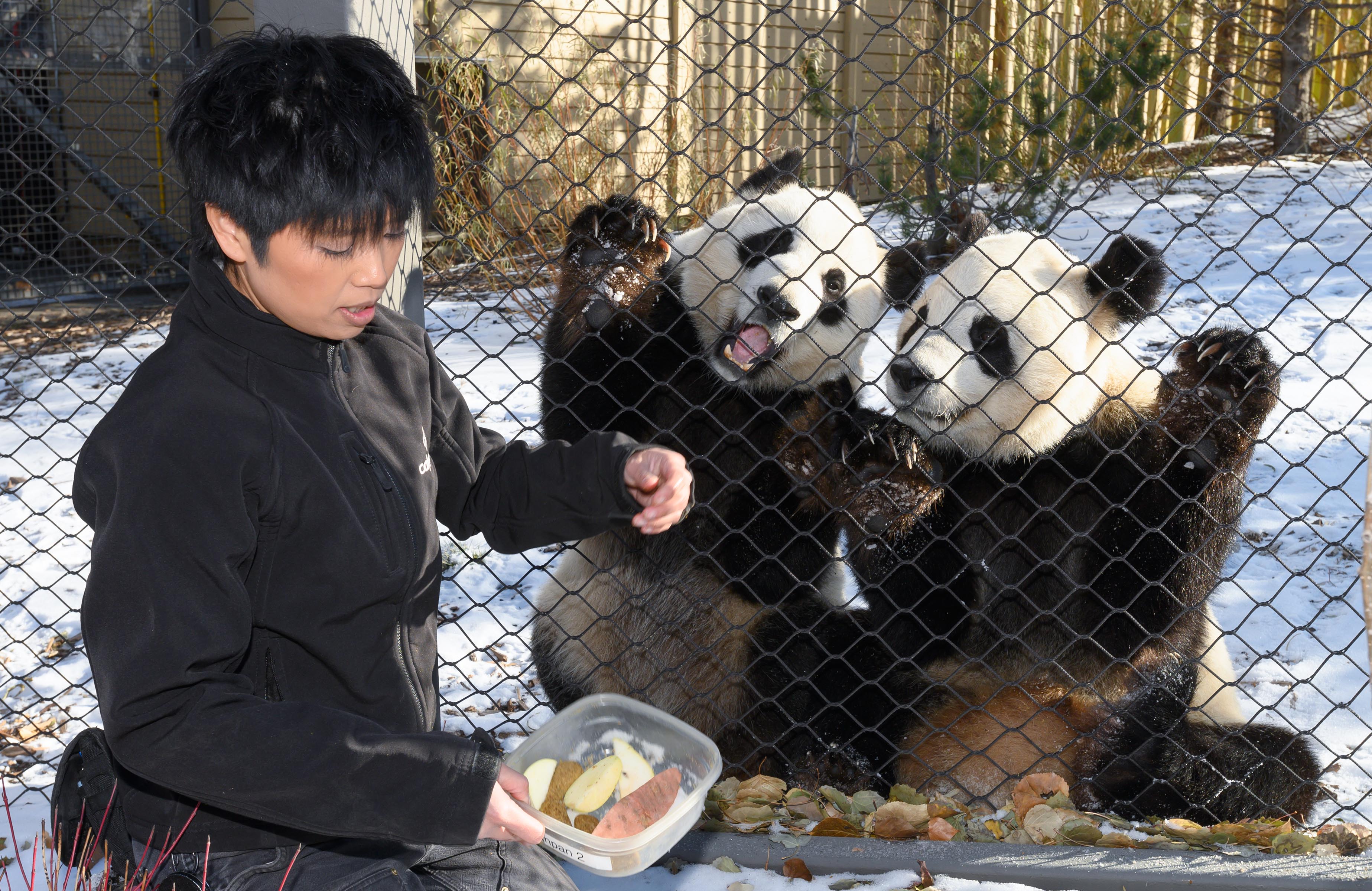 A keeper feeds panda cubs Jia Panpan and Jia Yueyue in the Calgary Zoo, Canada, Oct. 30, 2019. Panda cubs Jia Panpan and Jia Yueyue in Canada's Calgary Zoo will be moving to the Giant Panda Research Base in Chengdu, capital of China's southwestern Sichuan Province, in early 2020, according to the Calgary Zoo. Jia Panpan, a male, and Jia Yueyue, a female, came to Calgary city in March 2018, and they are now almost 4 years old. The panda twins are leaving Calgary as the term of their loan agreement between Canada and China has come to an end. (Photo by Andrew Soong/Xinhua)