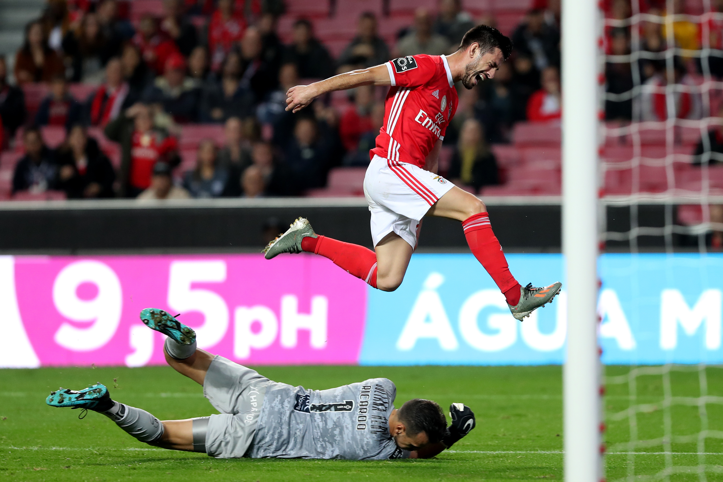 Pizzi (Top) of Benfica jumps over Portimonense's goalkeeper Ricardo Ferreira during their Portuguese League football match at the Luz stadium in Lisbon, Portugal, on Oct. 30, 2019. (Photo by Pedro Fiuza/Xinhua)