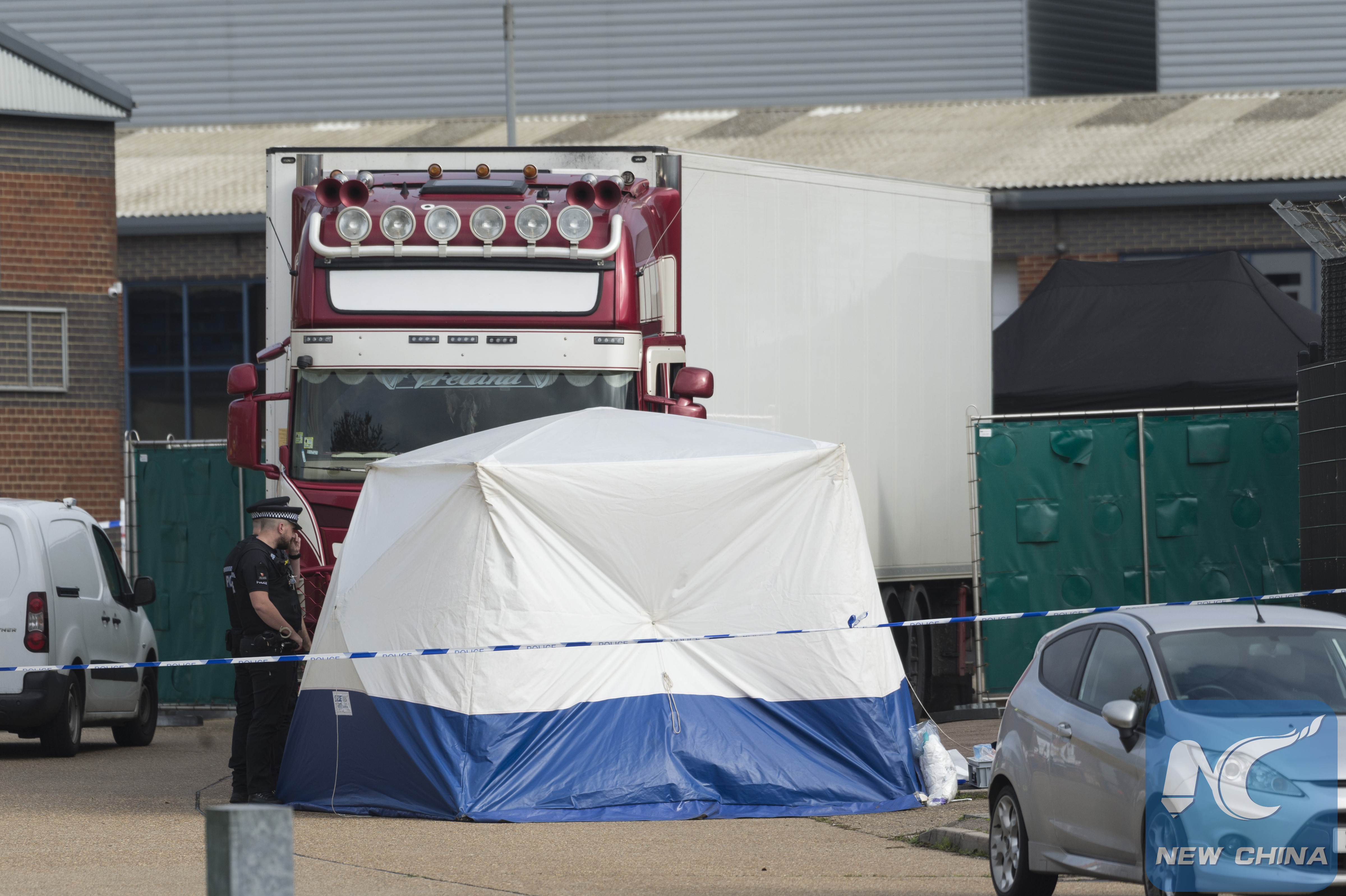 Police officers work at the scene where 39 bodies were found in a shipping container at Waterglade Industrial Park in Essex, Britain, on Oct. 23, 2019. Essex police said Friday they believe the victims of the lorry container deaths are Vietnamese nationals. (Photo by Ray Tang/Xinhua)