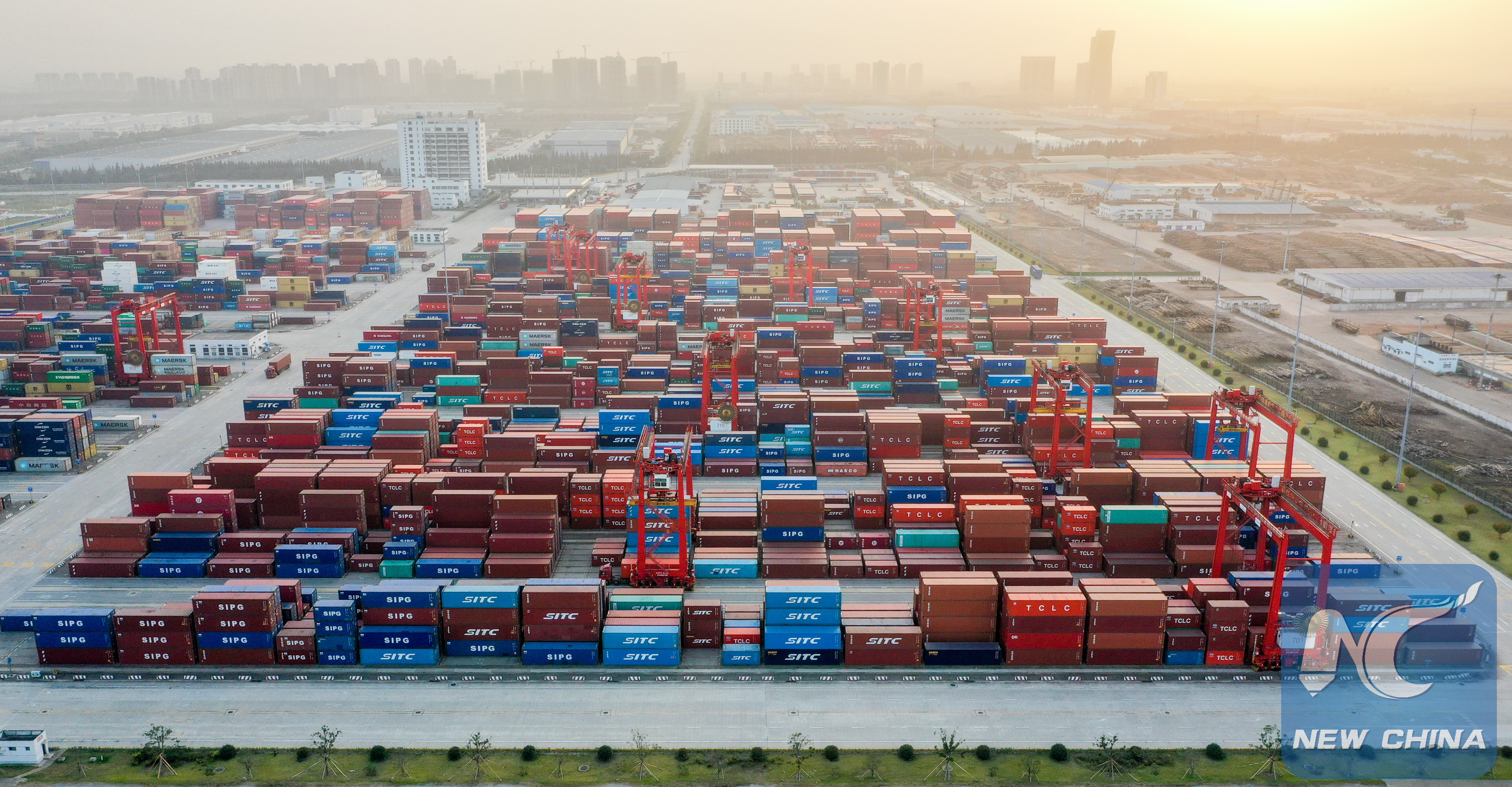 Aerial photo taken on Oct. 30, 2019 shows a view of a container port in Taicang, east China's Jiangsu Province. Taicang has been making great efforts to improve business environment through facilitating administrative procedures for enterprises including registration, project approval and tax registration in recent years. As a result, Taicang has built economy and trade relations with over 160 countries and regions and attracted investment of over 1,500 foreign enterprises. (Xinhua/Li Bo)