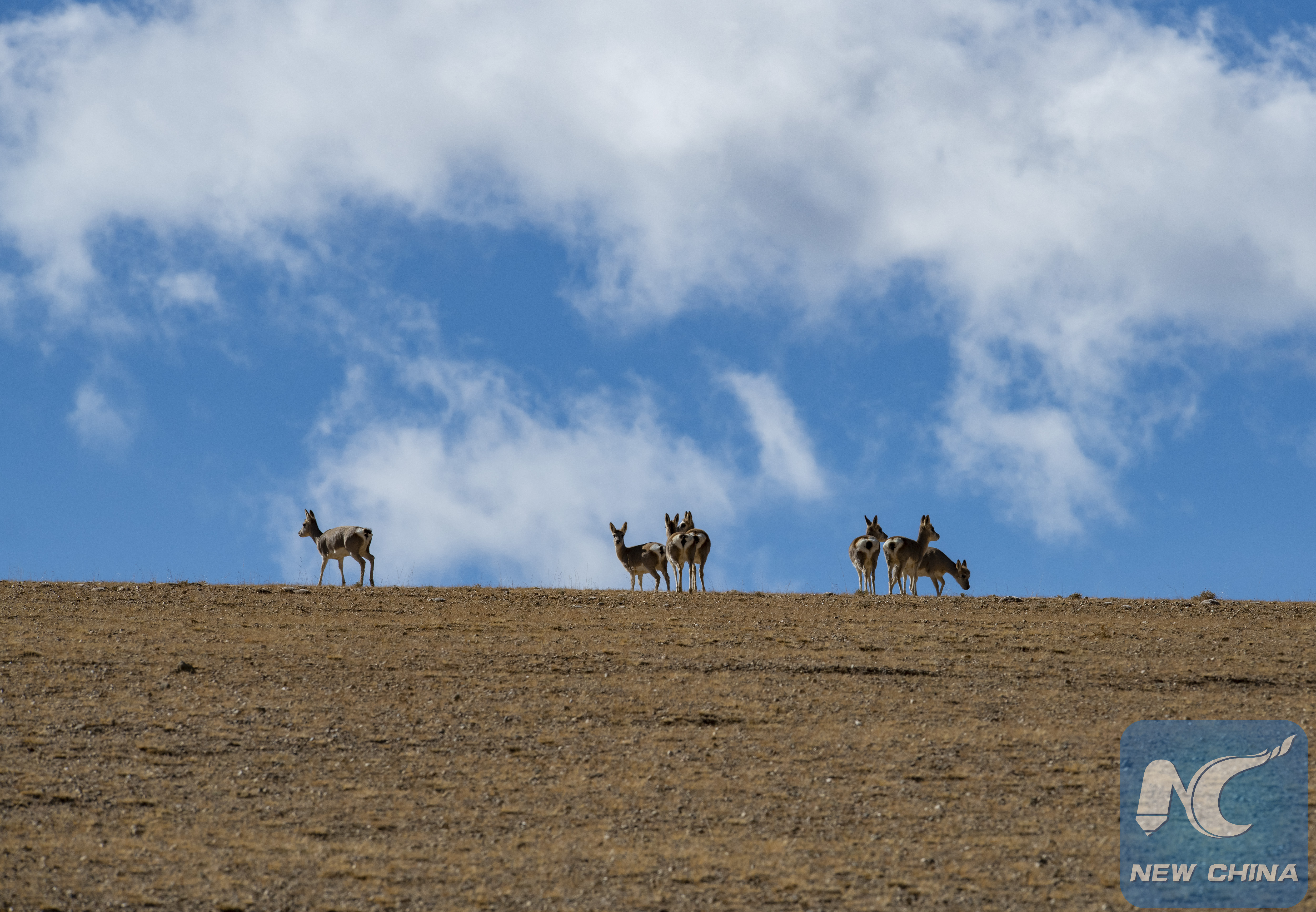 Photo taken on Oct. 31, 2019 shows a flock of Tibetan antelopes near Baiku Co (Baiku Lake), southwest China's Tibet Autonomous Region. (Xinhua/Sun Fei)