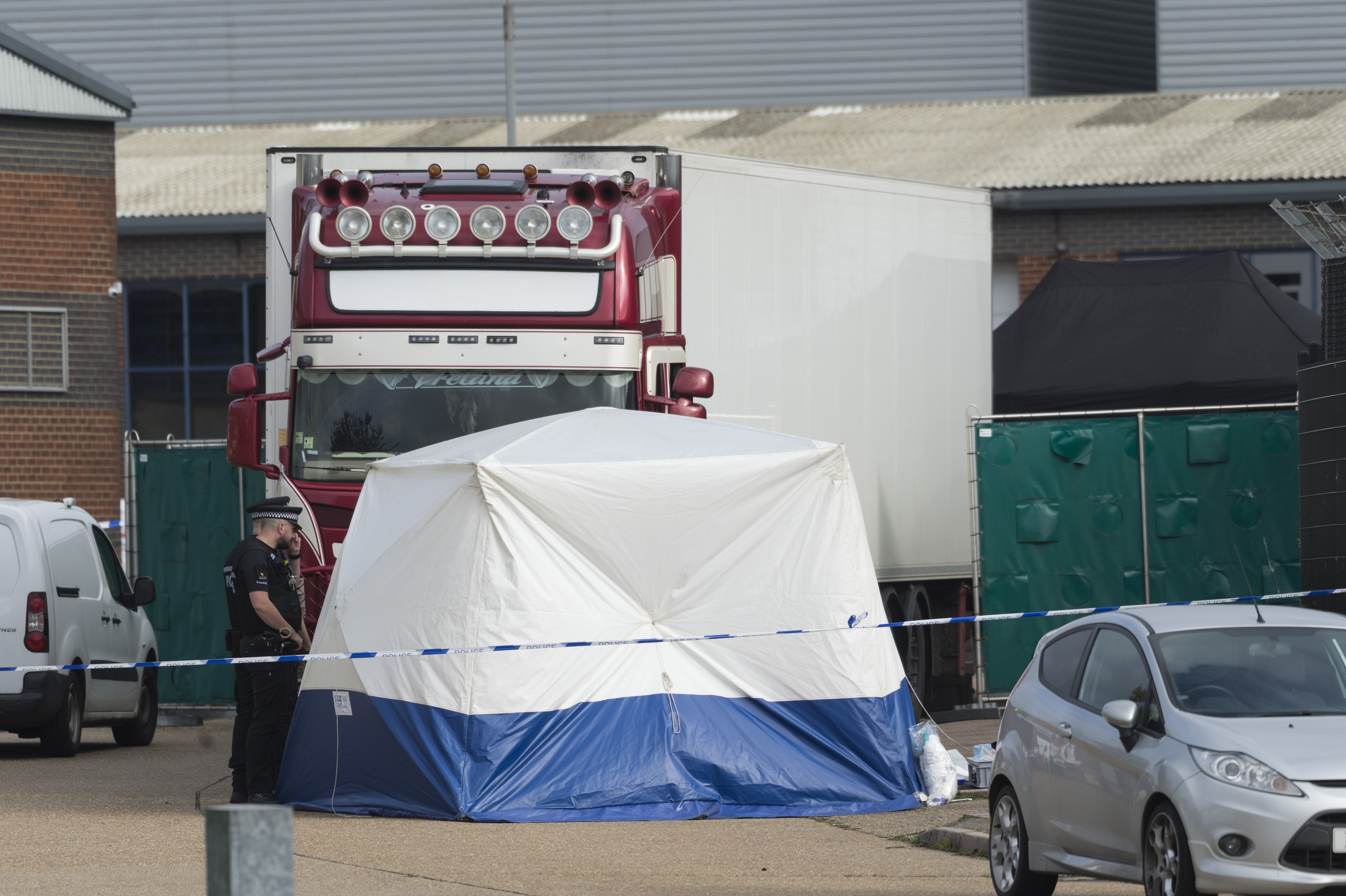 Police officers work at the scene where 39 bodies were found in a shipping container at Waterglade Industrial Park in Essex, Britain, on Oct. 23, 2019. Essex police said Friday they believe the victims of the lorry container deaths are Vietnamese nationals. (Photo by Ray Tang/Xinhua)