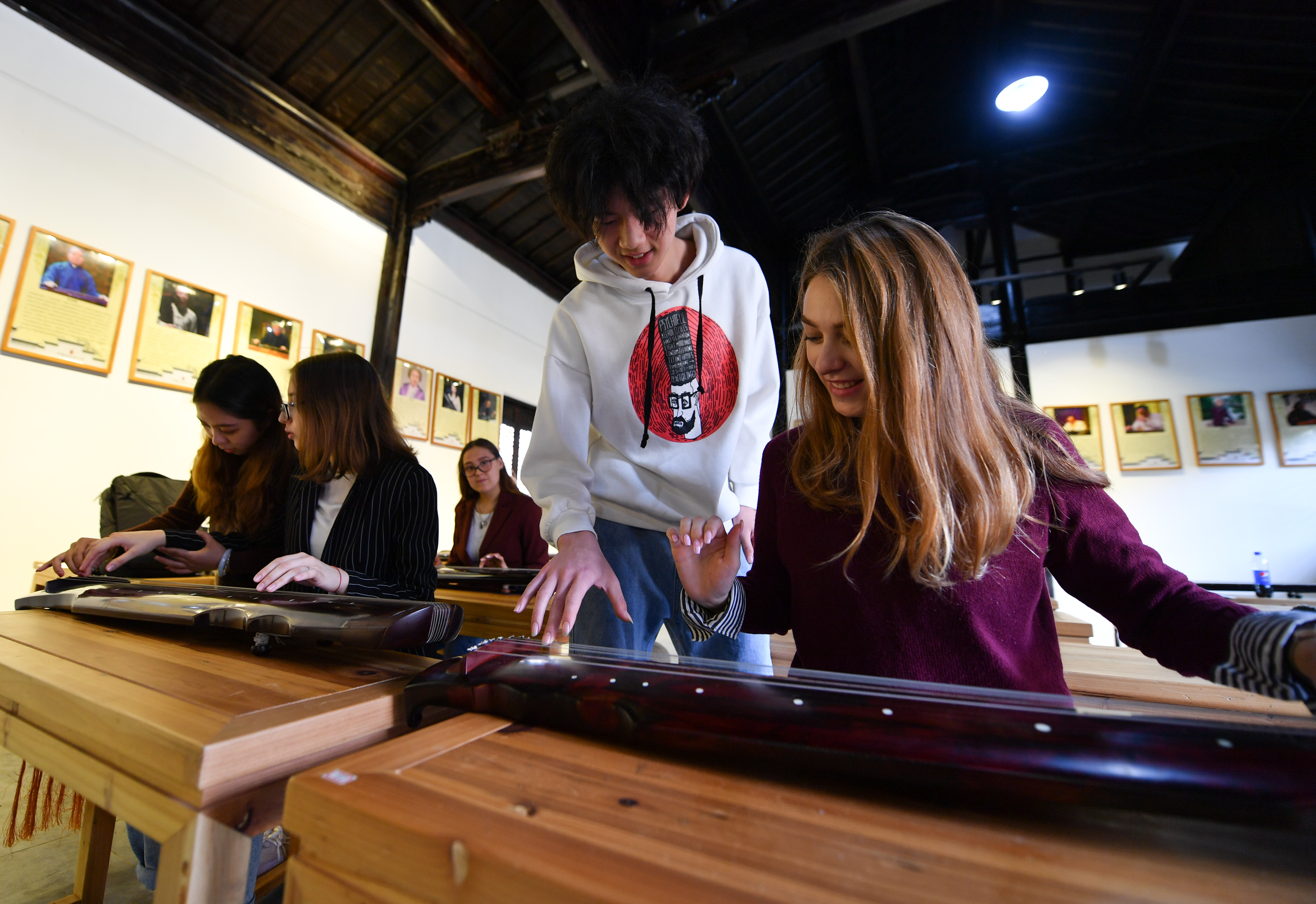 Melchakova Nataliia (1st R) learns Guqin, a seven-string traditional Chinese musical instrument, at East China Jiaotong University in Nanchang, east China's Jiangxi Province, Oct. 31, 2019. (Xinhua/Hu Chenhuan)