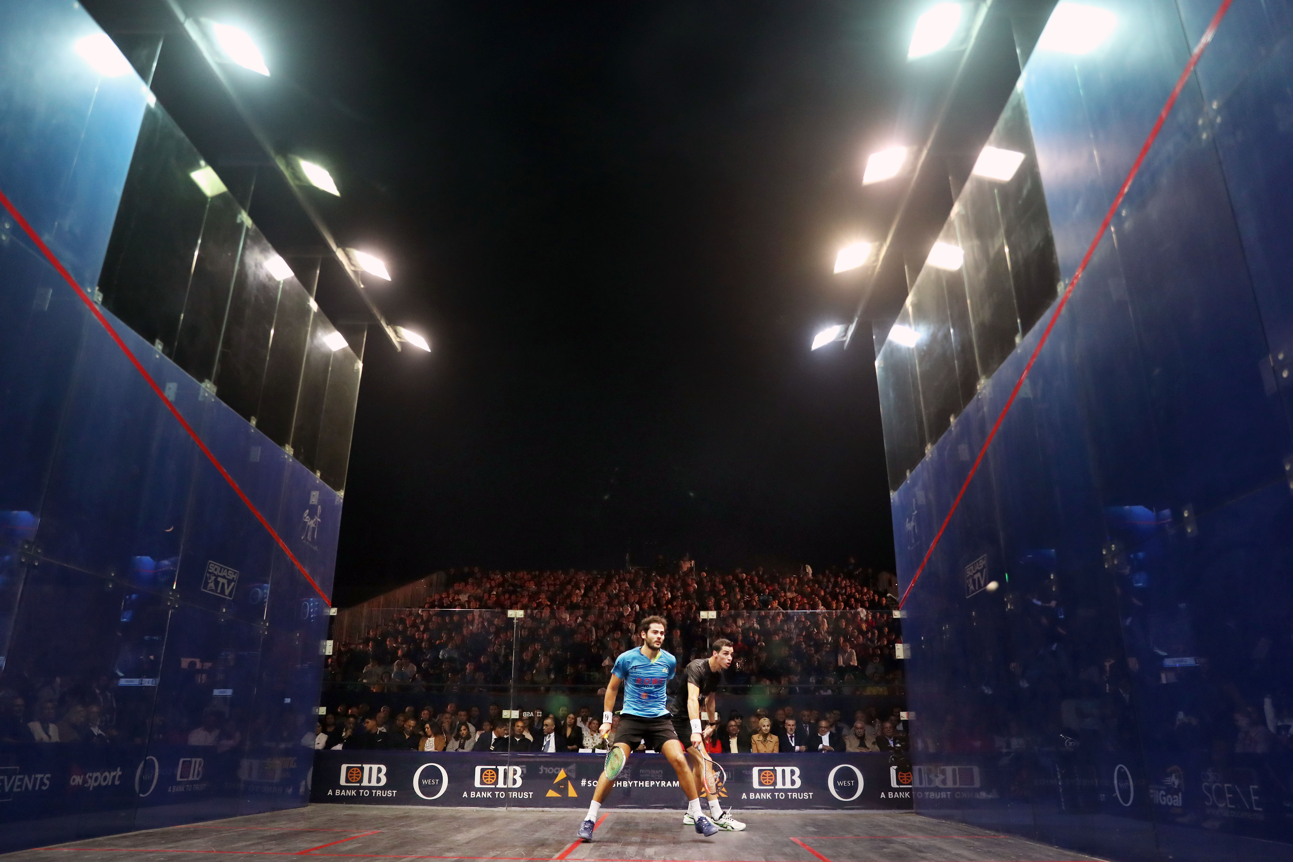 Karim Abdel Gawad (L) of Egypt competes with Ali Farag of Egypt during the Men's Egyptian Squash Open final in Giza, Egypt, on Nov. 1, 2019. (Xinhua/Ahmed Gomaa)