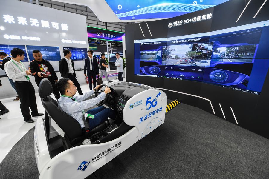 A remote-control driving system based on the 5G technology is displayed during the Light of Internet Expo in Wuzhen, east China's Zhejiang Province, Oct. 18, 2019. (Xinhua/Xu Yu)