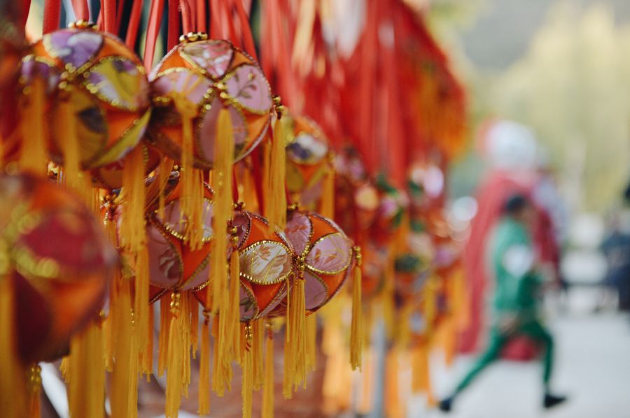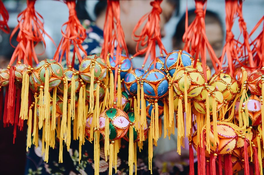 Photo taken on Nov. 4, 2019 shows embroidered balls in Jiuzhou ancient town of Jingxi City. (Xinhua/Cui Bowen)
