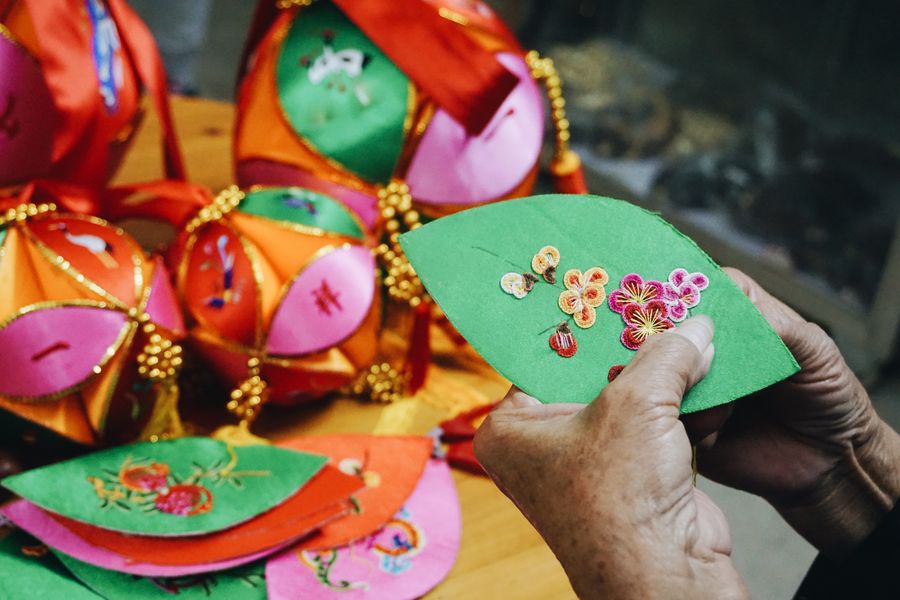 Photo taken on Nov. 4, 2019 shows embroidered ball-shaped lanterns in Jiuzhou ancient town of Jingxi City, south China's Guangxi Zhuang Autonomous Region. (Xinhua/Cui Bowen)