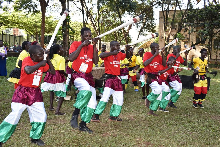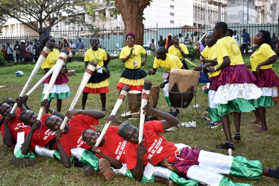 Dancers perform during the closing ceremony of the 2019 Uganda National Cultural Centre annual art and culture festival in Kampala, capital of Uganda, Nov. 3, 2019. (Xinhua/Nicholas Kajoba)■