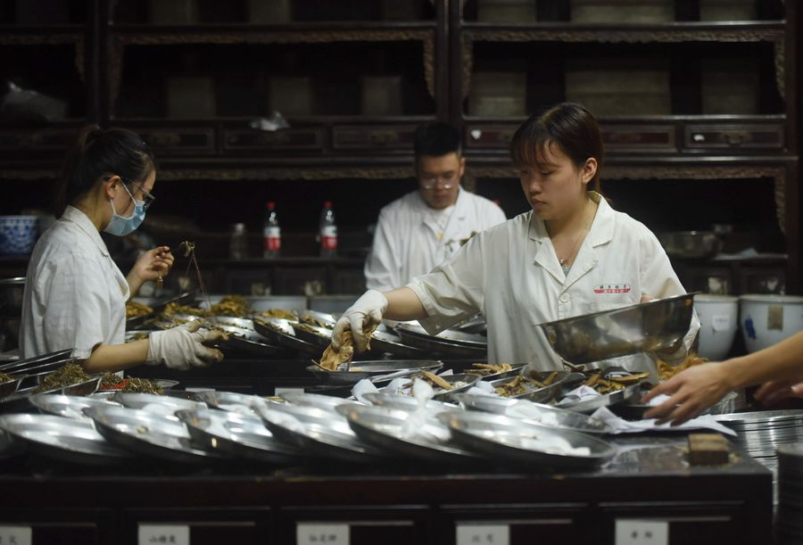Staff members of a pharmacy fill prescriptions of Traditional Chinese Medicine for patients in Hangzhou, east China's Zhejiang Province, May 26, 2019. (Xinhua/Long Wei)