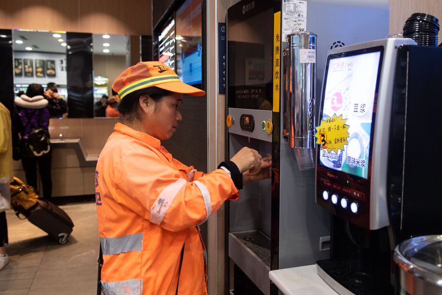 A sanitation worker gets direct drinking water in a Jianning station in city of Zhuzhou, central China's Hunan Province, Nov. 17, 2019. (Xinhua/Chen Sihan)