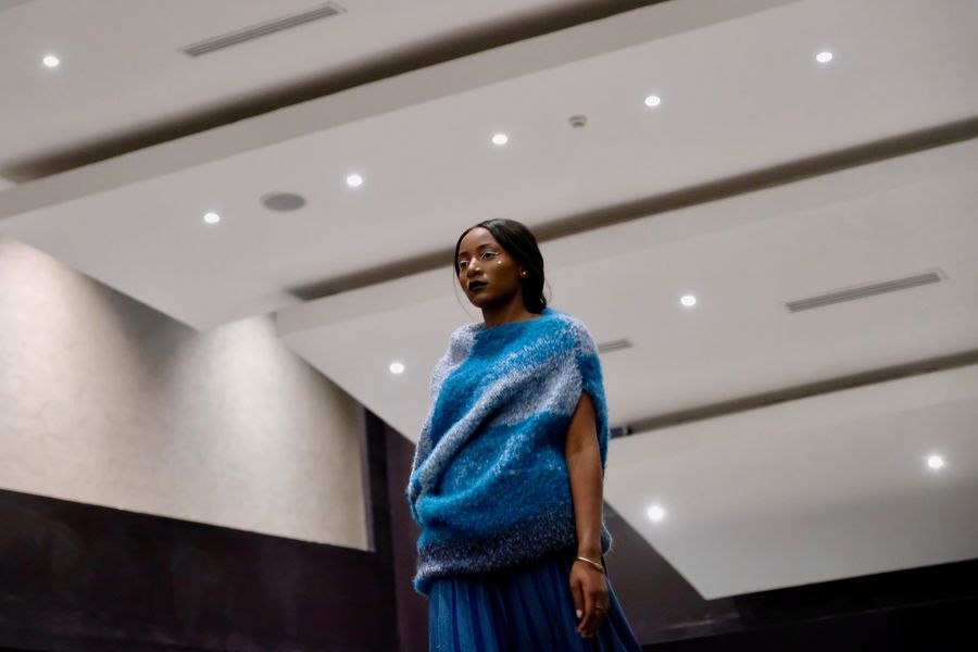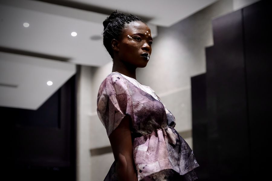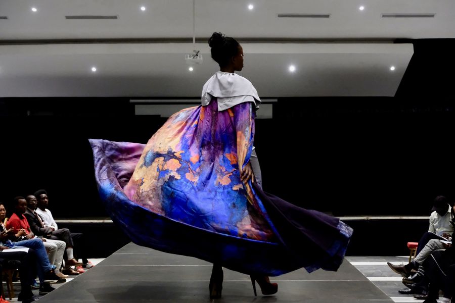 Kenyan models display the fashion clothes of contemporary Chinese art designed by Chinese abstract artists on the stage, in Eldoret, Kenya, on Nov. 19, 2019. (Xinhua/Yang Zhen)