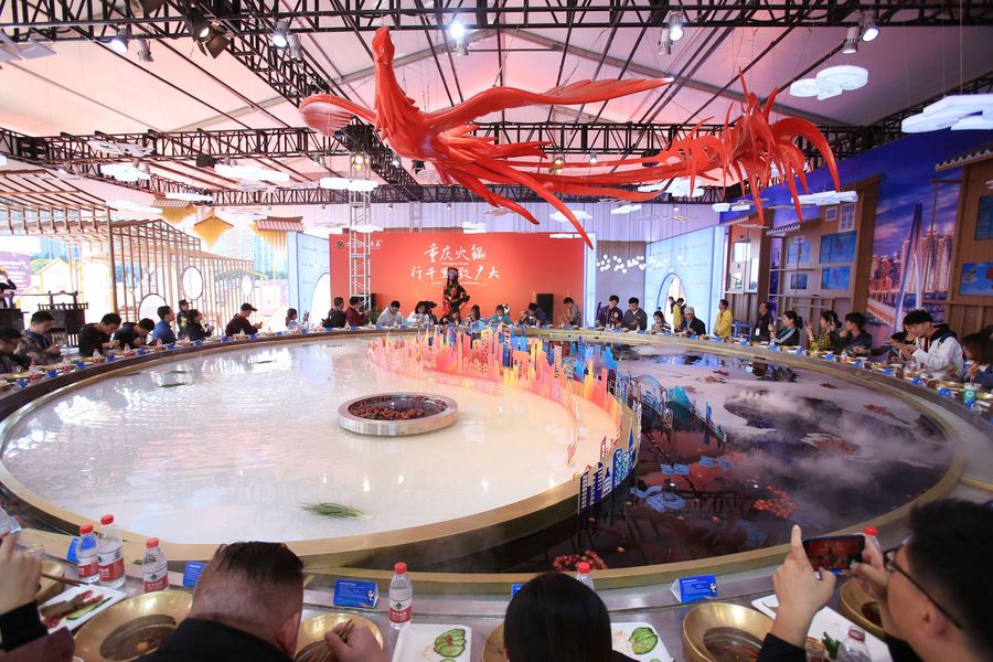 Diners eat around an extra large hotpot at an exhibition area for the second China International Import Expo (CIIE) at the National Exhibition and Convention Center (Shanghai) in east China's Shanghai, Nov. 8, 2019. (Xinhua/Sui Xiankai)