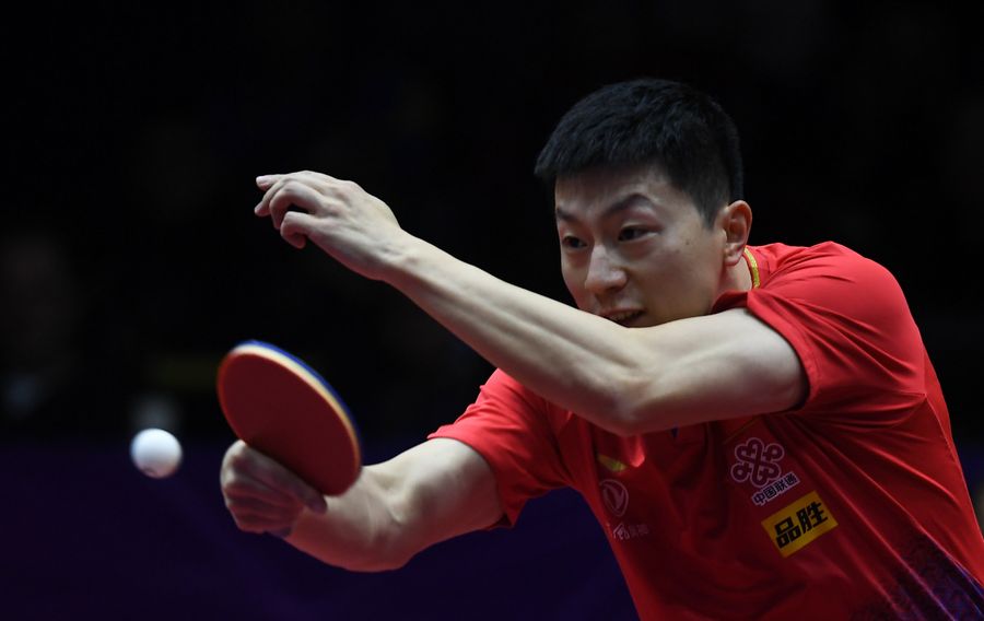 Ma Long returns a shot during the men's singles quarterfinal match against Ovtcharov at the 2019 ITTF Men's World Cup. (Xinhua/Xue Yubin)