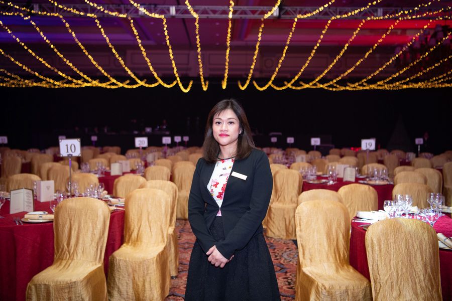 Paulina Pereira Che works at a banquet hall in Macao, south China, Nov. 29, 2019. (Xinhua/Cheong Kam Ka)
