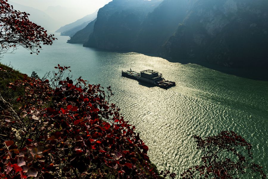 A boat sails along the Three Gorges section of the Yangtze River in Zigui County of Yichang, central China's Hubei Province on Dec. 7, 2019. (Photo by Zheng Jiayu/Xinhua)